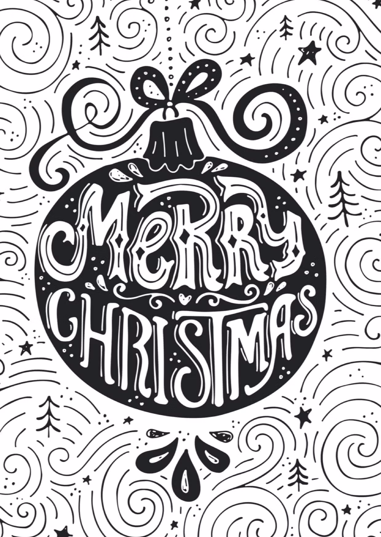 Ett mycket vackert och stilrent kort med hälsningen Merry Christmas i underbart, snirklig handstil omgiven av grafisk vacker ritkonst. Kortet är lite extra lyxigt eftersom det har rundade hörn.