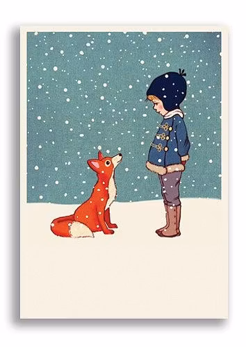 Fint kort där en rar räv och ett bedårande barn möter både varandra och vintern. Trots att den ena har fyra ben och den andra har två, delar dom samma nyfikna blick! Under dalande mjuka snöflicngor kan ny vänskap uppstå. Skicka det söta kortet till någon du vill upptäcka saker tillsammans med. Kortet är vackert illustrerat i mjuka färger med lite vintage-känsla.