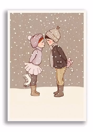 Rart kort med värme i en kall vinter. Här får båda barnen den första pussen medan snöflingorna dalar ner runt omkring dem. Kortet är vackert illustrerat i mjuka färger med lite vintage-känsla.