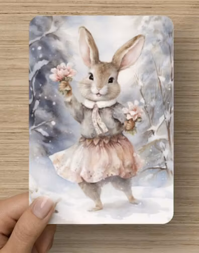 Ett härligt vinterkort med den lilla kaninen som är så lycklig bland snö och blommor. Kortet är lite extra lyxigt eftersom det har rundade hörn.