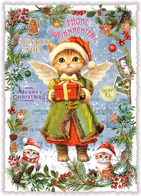 På kortet finns texten "Frohe Weihnachten!", "Joyeux Noel", "Merry Christmas" och "God Jul".