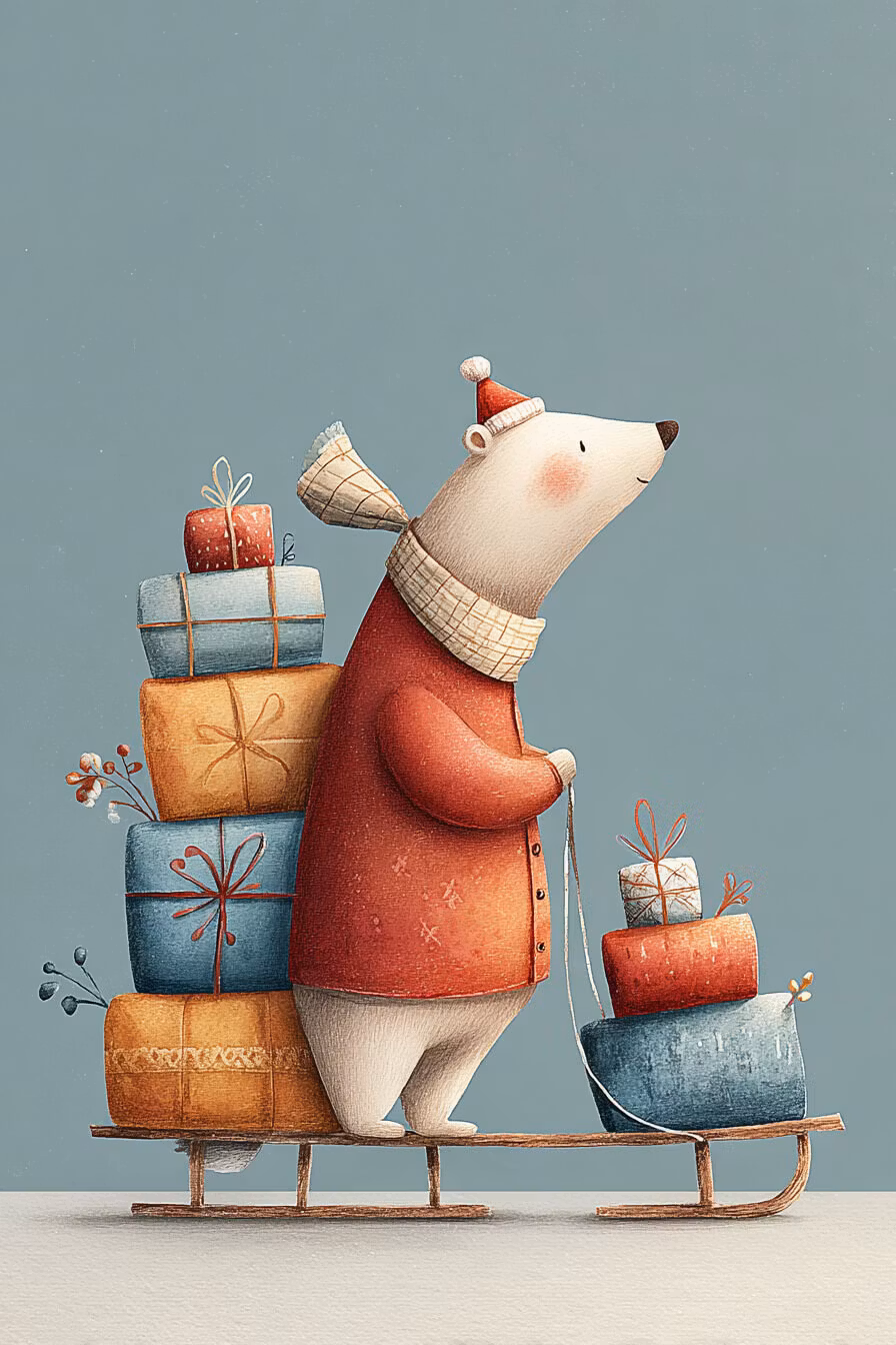 Här kommer björnen åkande på sin släde som är full av julklappar till nära och kära.