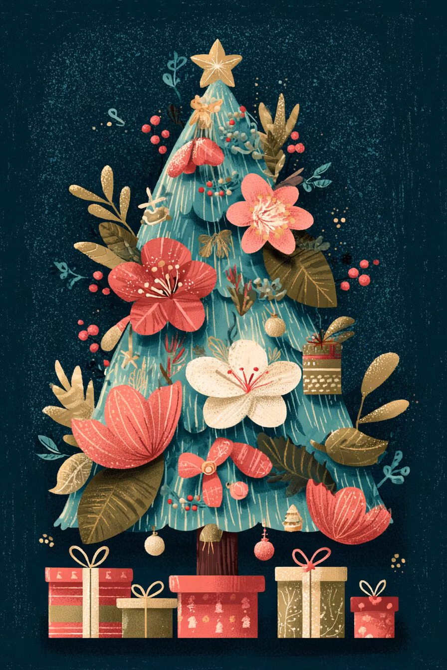 Ett härligt kort med granen som är full av vackra blommor. Mustiga och härliga färger.