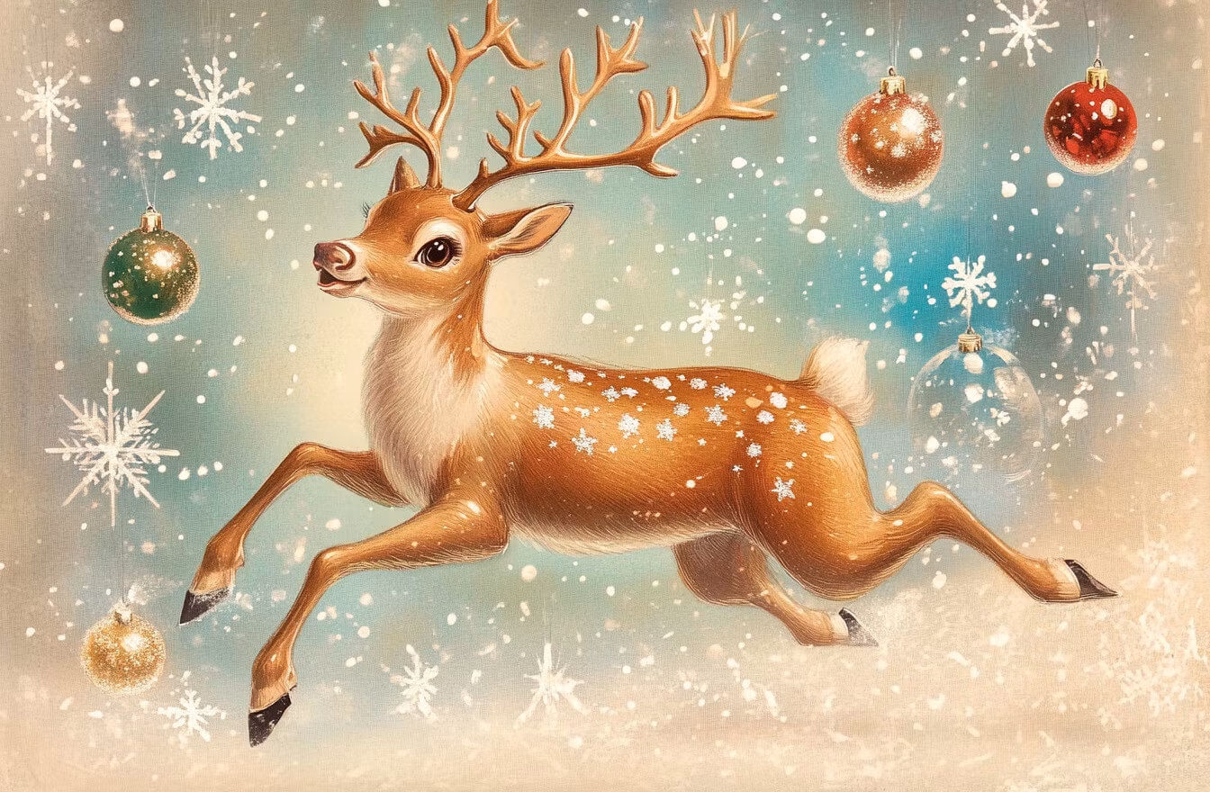 Underbart julkort med renen som skuttar fram över de snöklädda vidderna. Kortet har en härlig vintagekänsla både vad gäller motiv och färger.