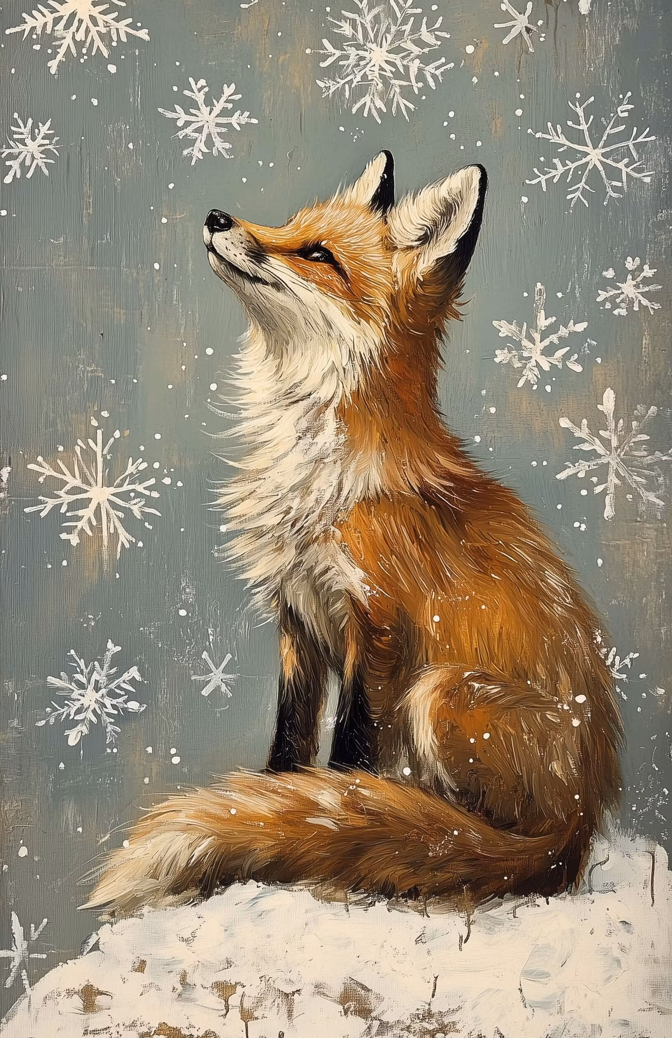 Underbart julkort med räven som lycklig tittar på snöflingorna som sakta dalar mot marken.