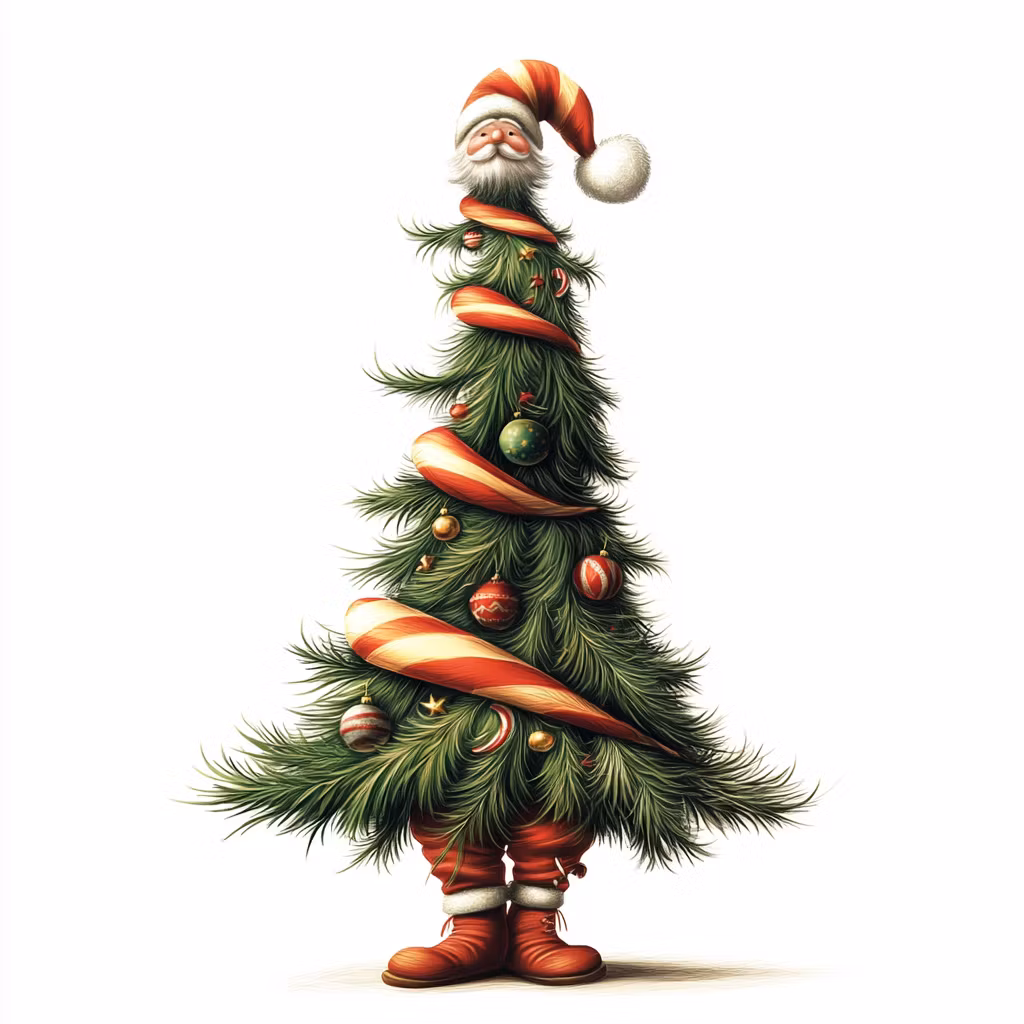 Härligt julkort med tomten som har råkat snurra in sig i granen.