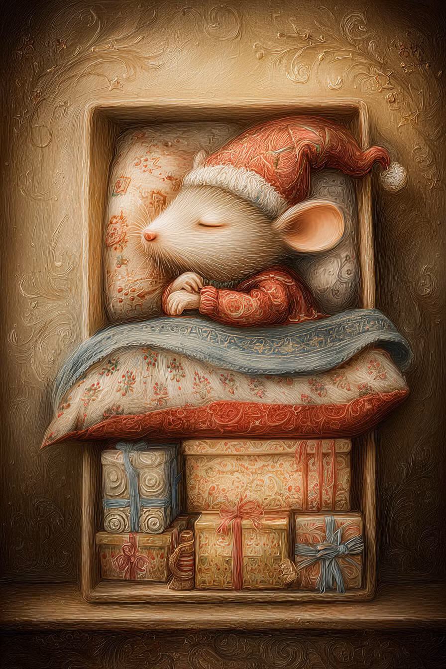 Här ligger den söta musen och sover, vid hans fötter finns alla julklappar som ska delas ut.