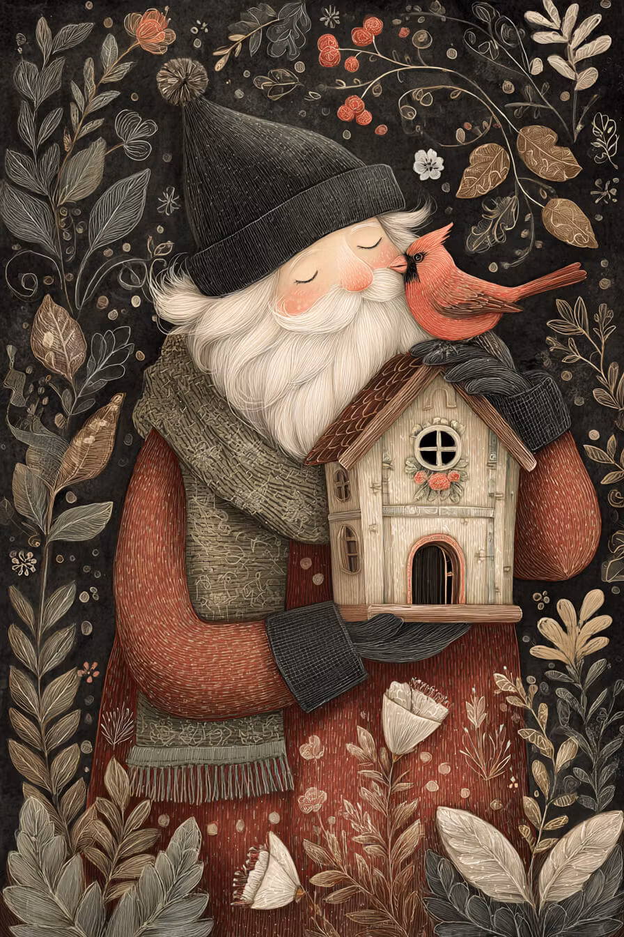 Här står tomten och den lilla fågel och myser, med den vackra fågelholken.