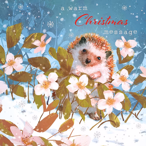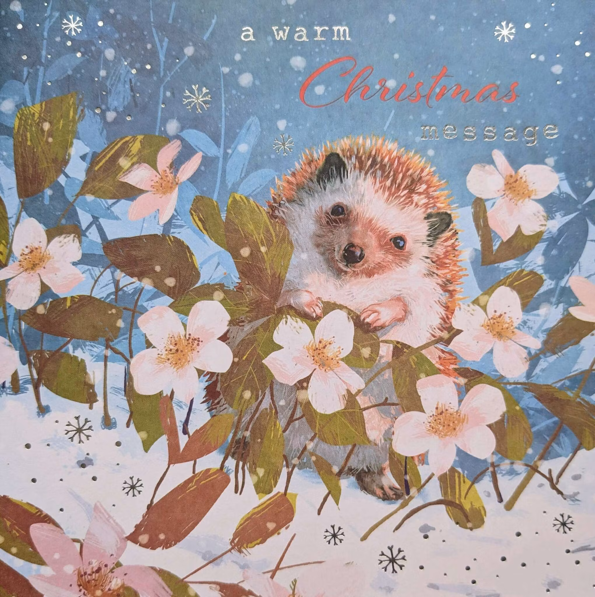 Härligt kort med den söta igelkotten som tittar fram bakom de vackra vinterblommorna