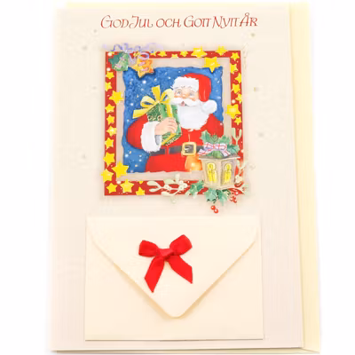 Det här är ett väldigt speciellt julkort. Kortet är dubbelvikt och du kan som vanligt skriva din hälsning inuti kortet. Det som är speciellt är att på framsidan av kortet sitter ett litet kuvert fastklistrat. Här kan du lägga ner en liten hälsning eller julklapp till mottagaren. Kanske kan du lägga ner en liten peng eller ett presentkort till något roligt ställe? Nu är det bara fantasin som sätter gränser. Kanske skapar du en liten biljett som kan bytas in mot en heldag på stan? Eller lägger du ner några vackra små ting i kuvertet? Eller lägger du ner en första ledtråd som är början på en kedja av ledtrådar som leder fram till mottagarens julklapp? Det är som sagt bara fantasin som sätter gränserna...