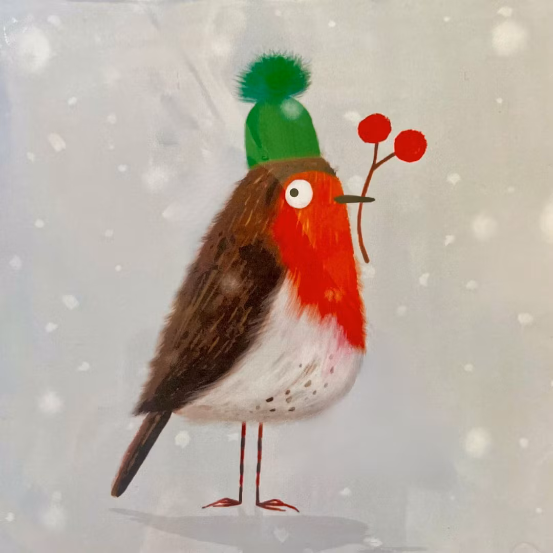 Underbart kort med fågeln i den fina, gröna mössan och en kvist med röda bär i näbben.