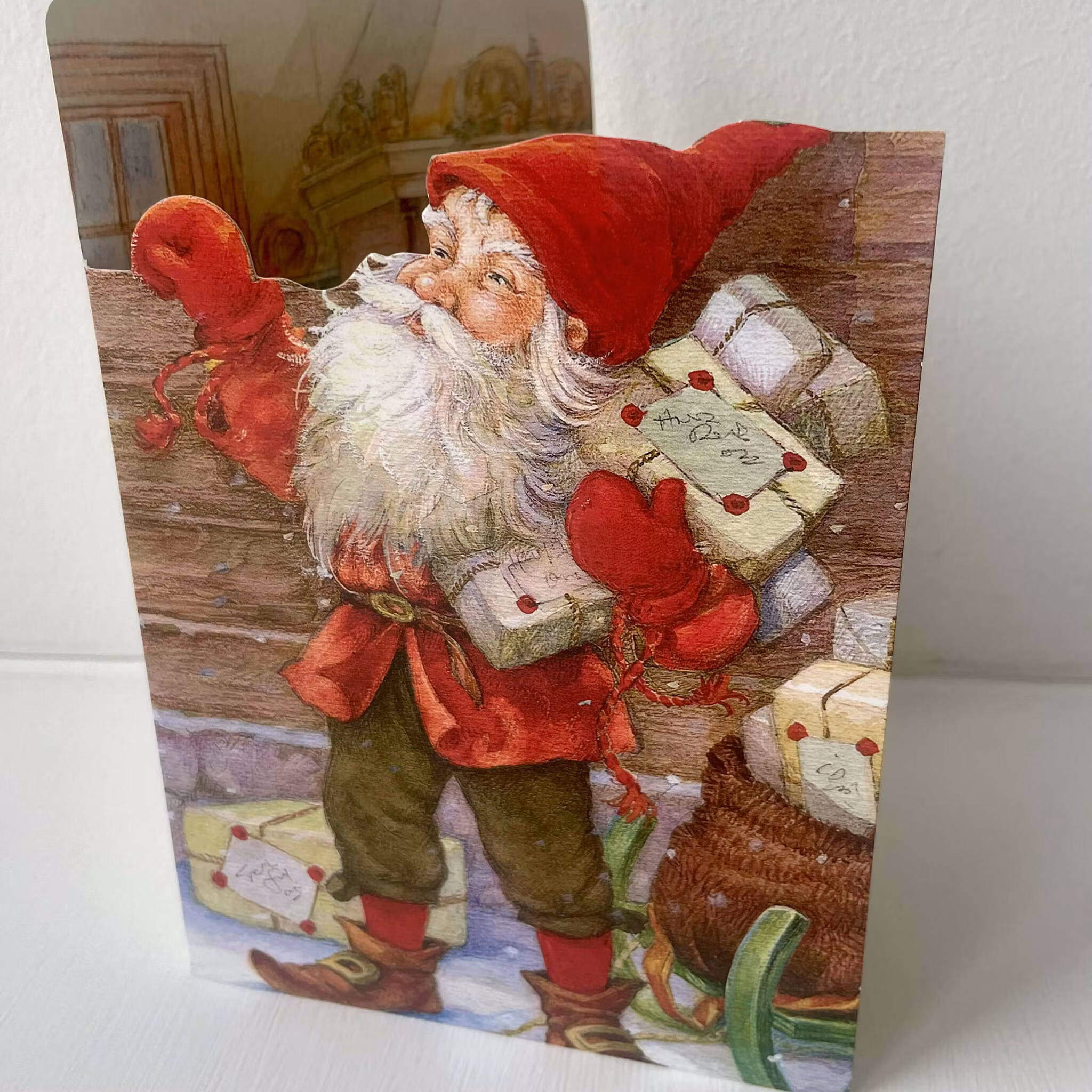 Det följer med ett fint kuvert med en tomte och orden "GOD JUL" tryckta på baksidan.