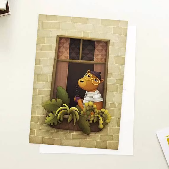 Fint kort av björnen som tittar ut genom sitt fönster. Kortet har underbart milda men härliga färger.Kortets papper har en vacker, matt yta och blir ett underbart litet kostverk om du sätter en ram runt det. Eller skicka kortet till någon du tycker mycket om eftersom detta är ett mycket speciellt och förtrollat kort!