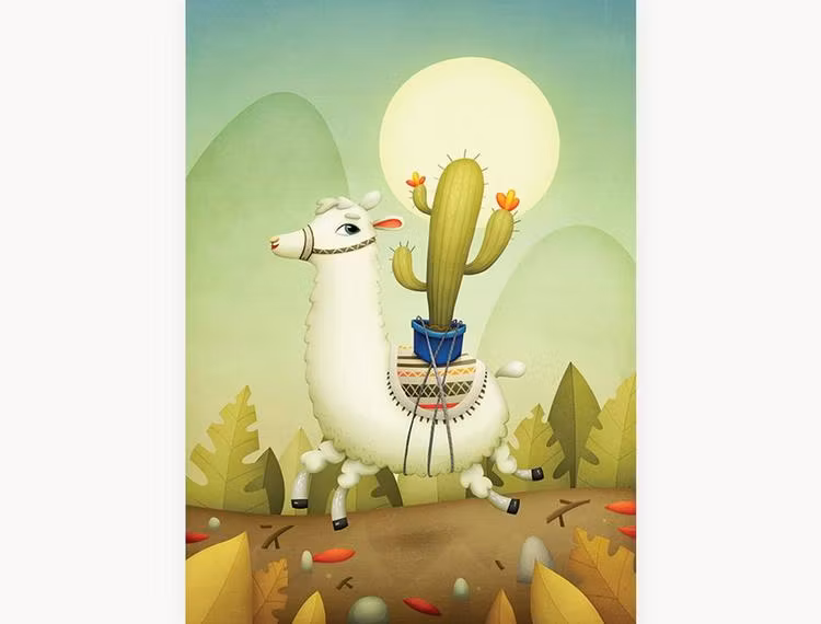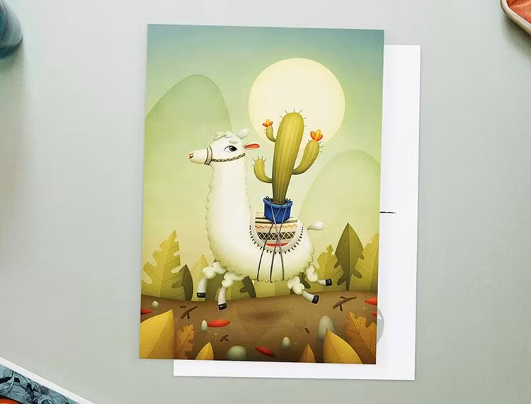 Härligt kort av en lama på resa. Kortet har underbart milda men härliga färger.Kortets papper har en vacker, matt yta och blir ett underbart litet kostverk om du sätter en ram runt det. Eller skicka kortet till någon du tycker mycket om eftersom detta är ett mycket speciellt och förtrollat kort!