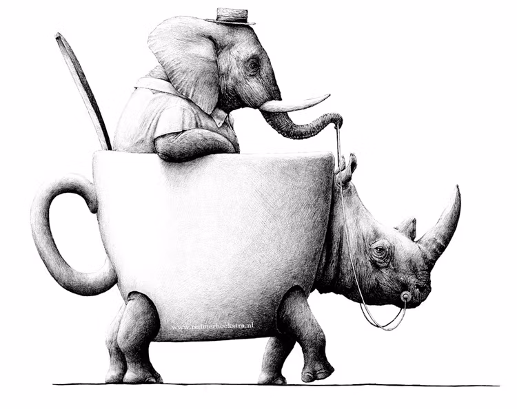 Elefanten färdas fram i en kopp som både styrs och drivs av en noshörning.