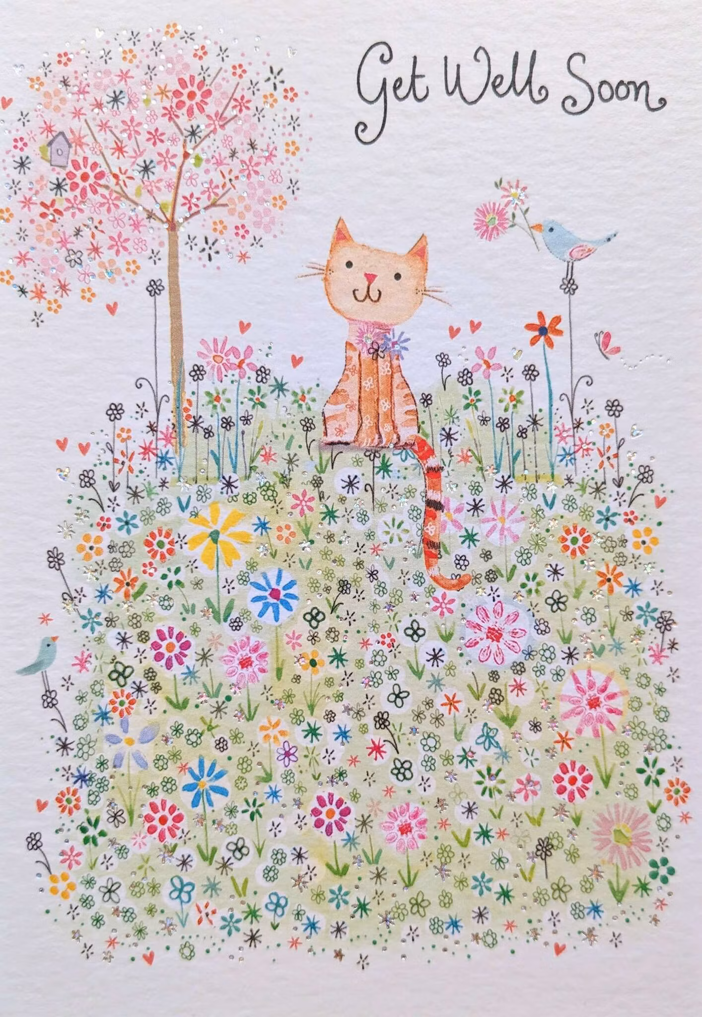 Här sitter katten och önskar att mottagaren av detta vackra kort snart ska krya på sig. På kortet finns texten "Get well soon".