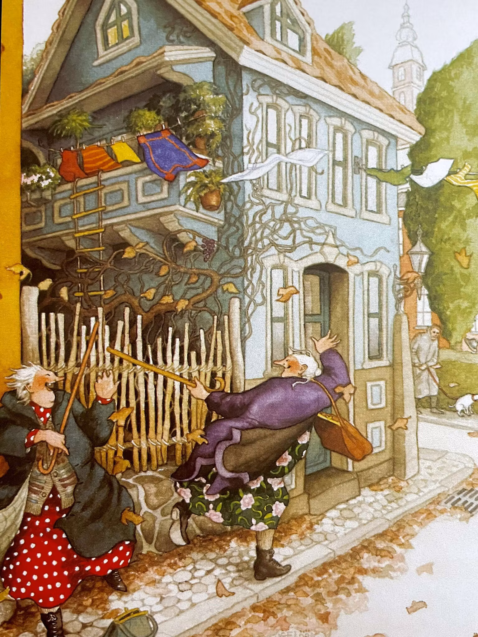 Här kommer de lyckliga damerna springande. Vad håller de på med? Är det något bus på gång?