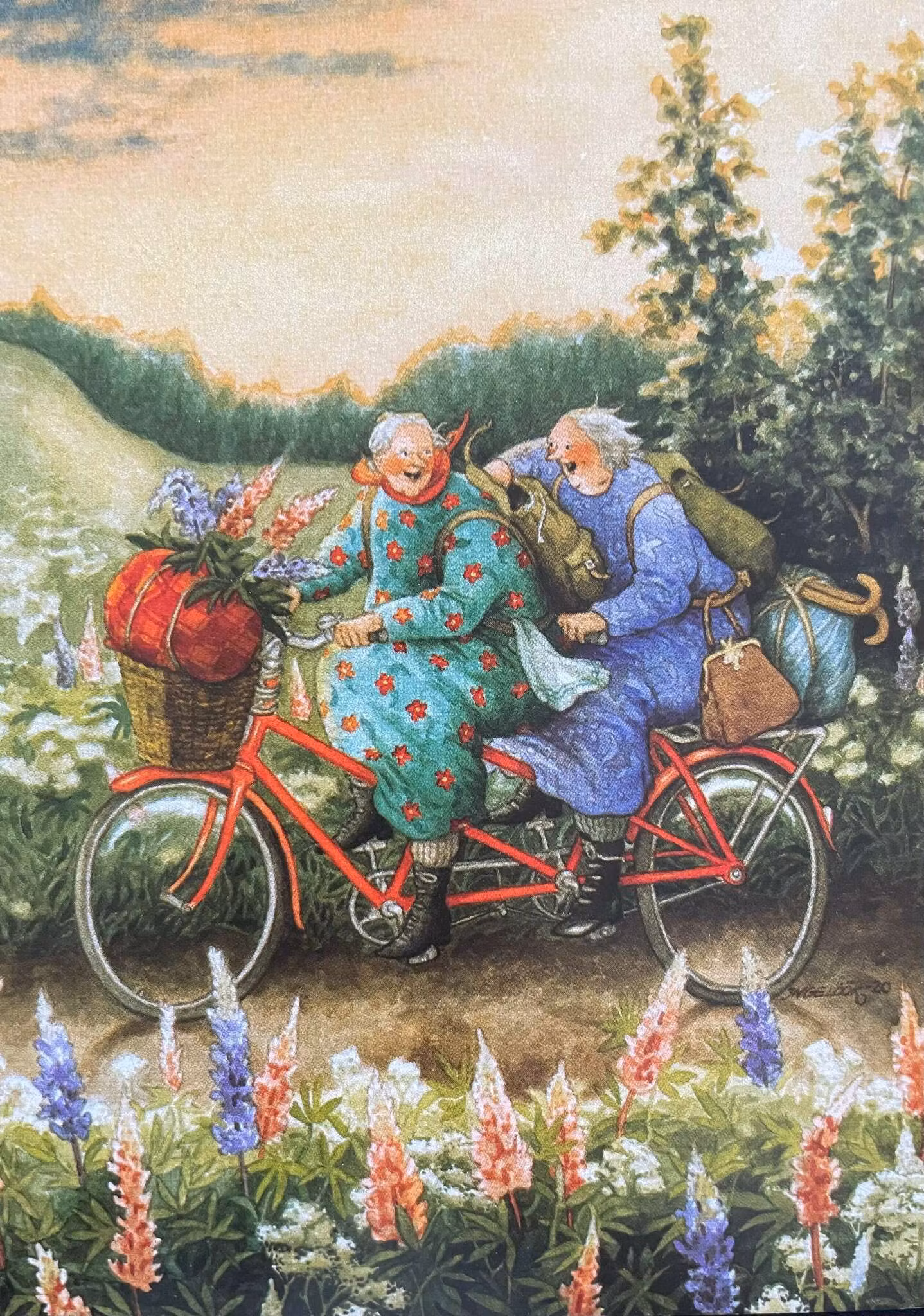 Finns det något härligare än att ta en cykeltur med sin bästa vän i solnedgången? Underbart kort med de lyckliga damerna av den finska konstnären Inge Löök.