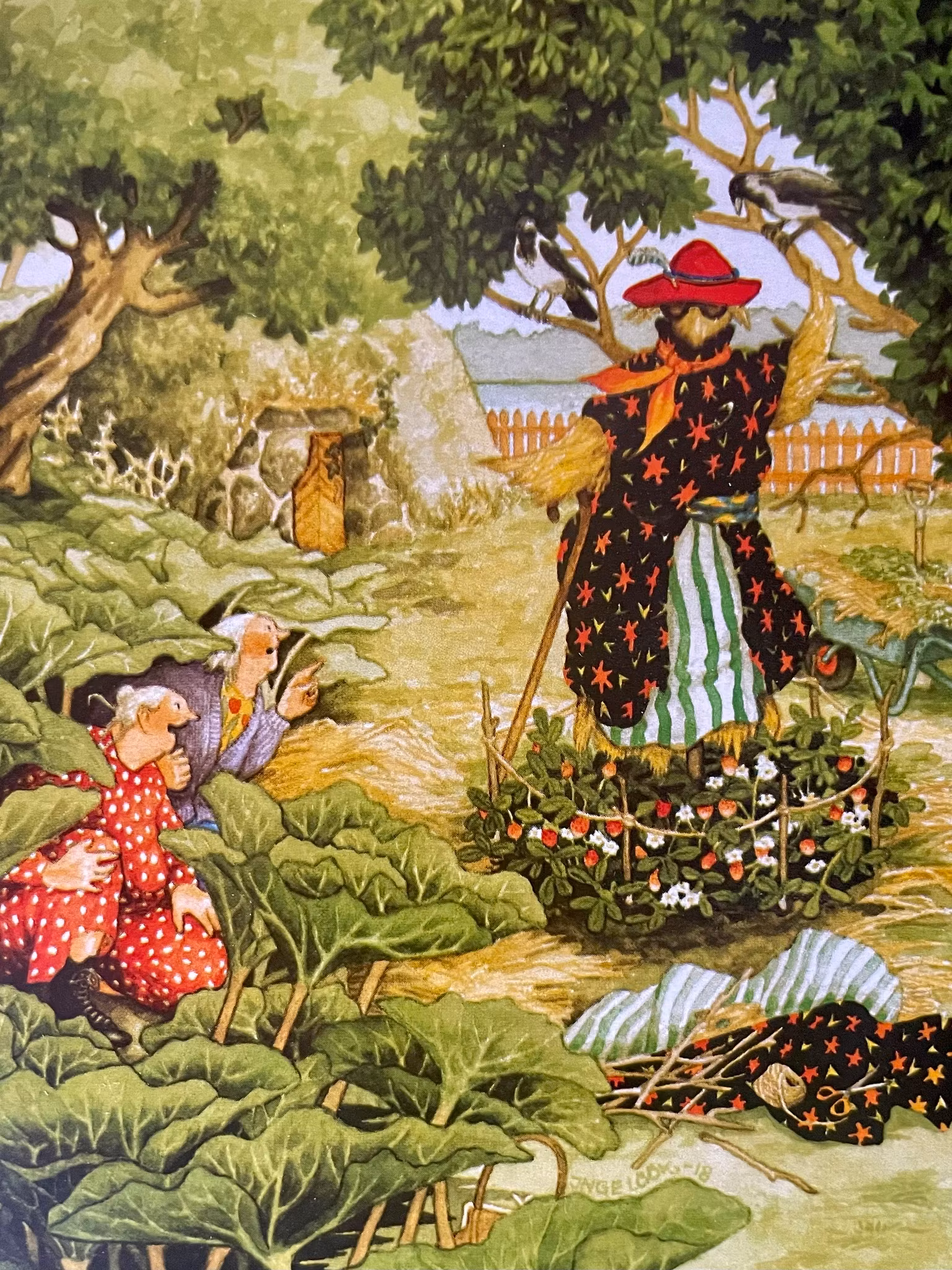 Här har de lyckliga damerna satt upp en fågelskrämma för att skydda sin jordgubbsplanering. Vi får se hur det går.