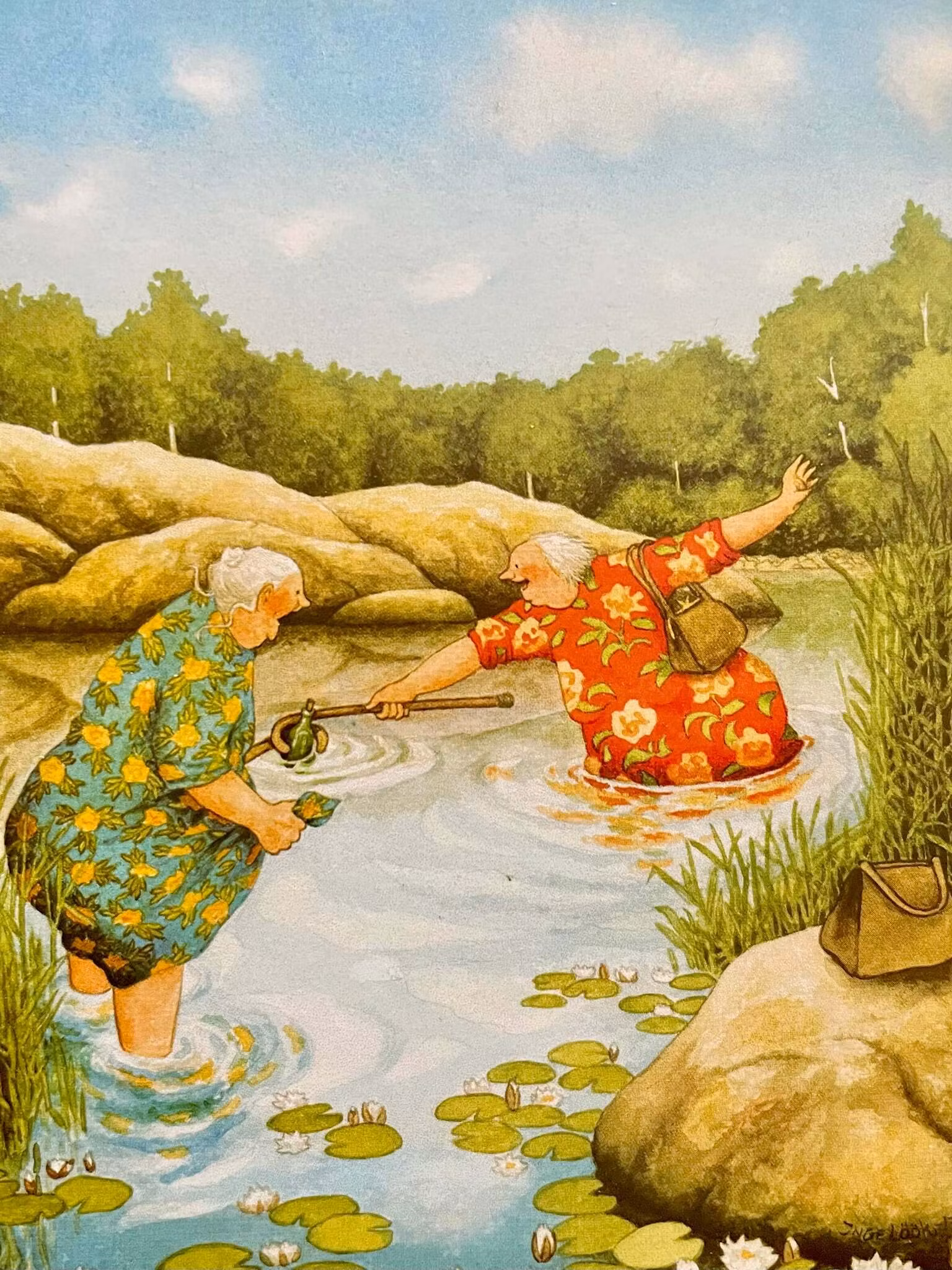 Här har de lyckliga damerna fått syn på en flaskpost i sjön och vadar ut för att hämta den.