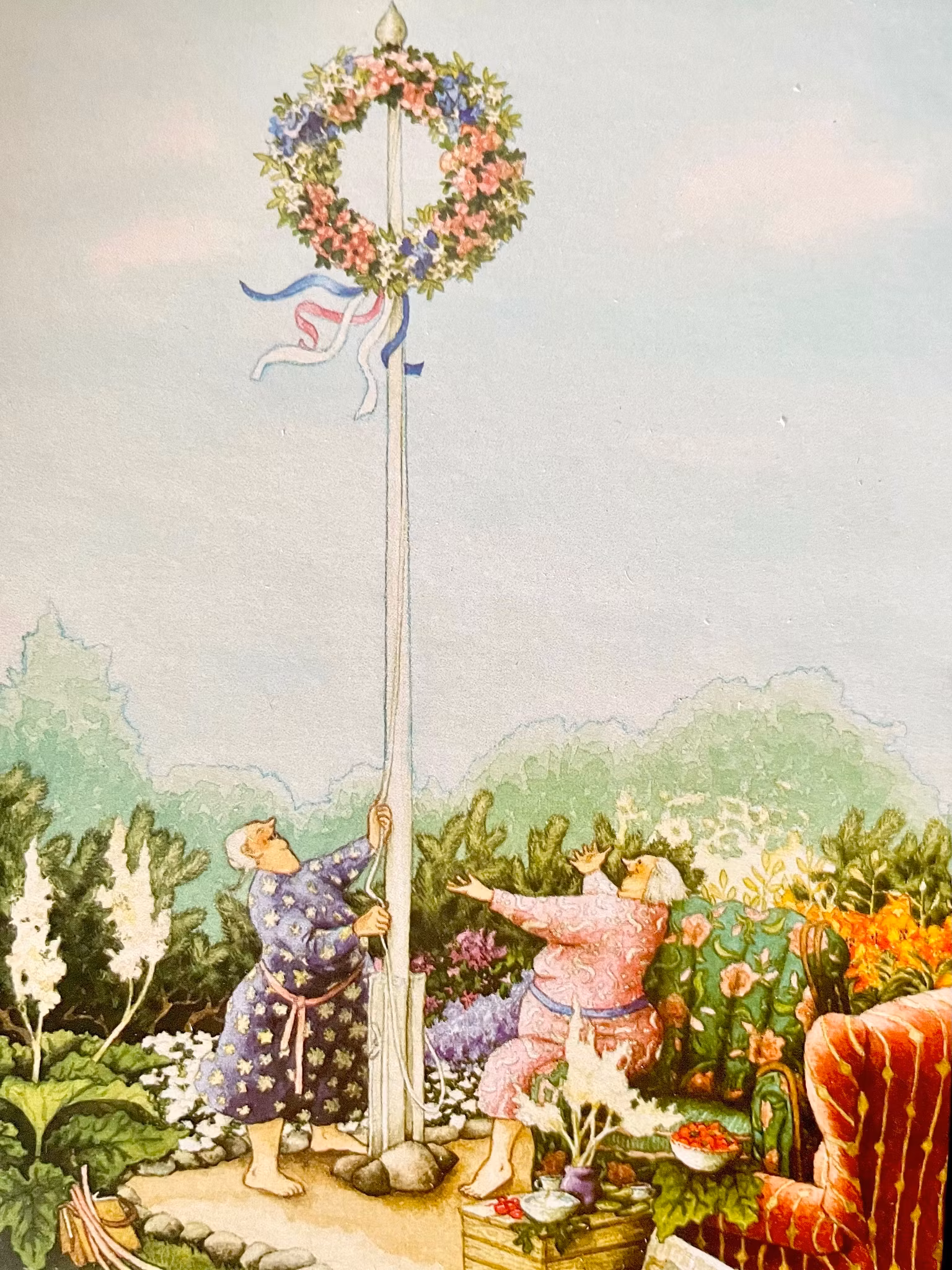 Nu är det dags för de lyckliga damerna att fira midsommar och det inleds traditionsenligt med att den vackra blomsterkransen ska högst upp i flaggstången. Det är ju ändå blommorna som är det finaste och de syns ju ännu mer om man hissar upp dem så högt man bara kan. Vem behöver då en midsommarstång?