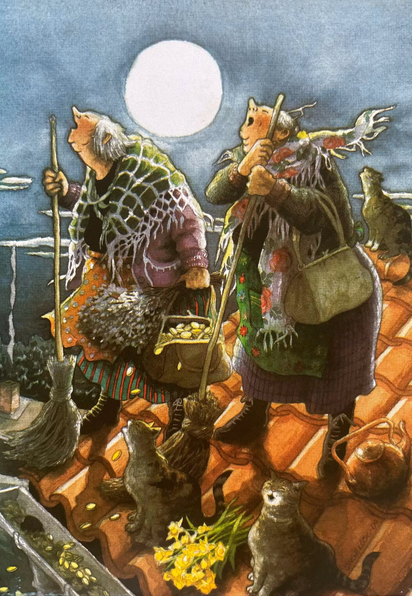 Här står de lyckliga damerna på taket och ylar mot månen i kapp med katterna