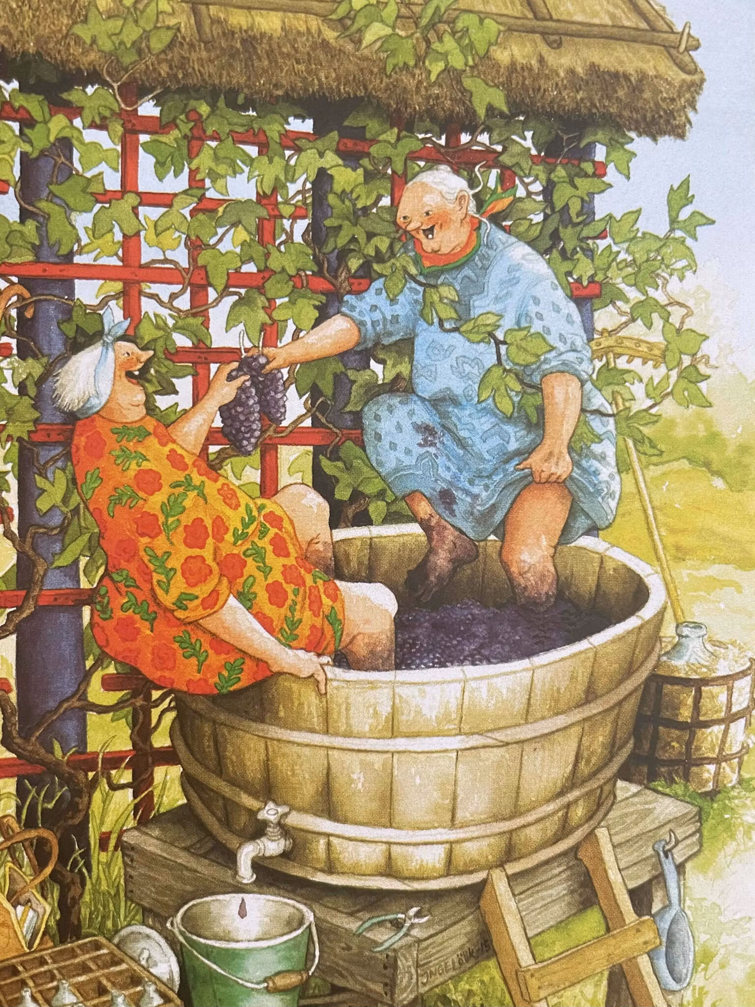 Här står de lyckliga damerna och trampar sitt eget vin. Har de odlat druvorna själva?
