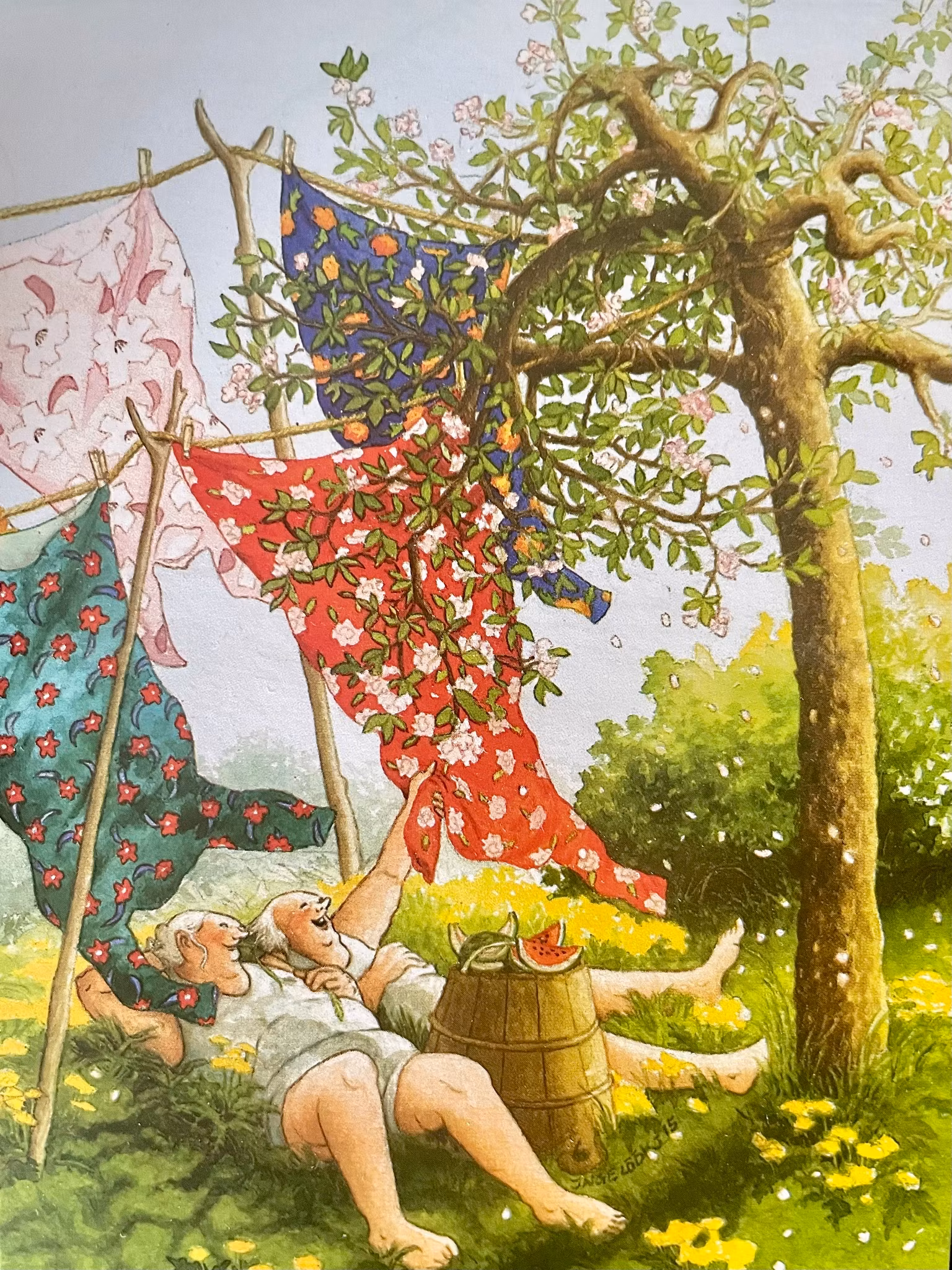 Här ligger de lyckliga damerna och njuter i halvskuggan under tvätten som torkas av den ljumma sommarvinden.