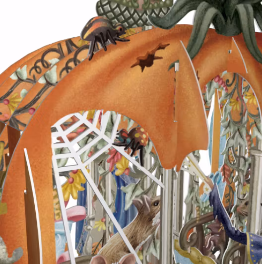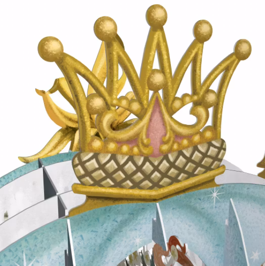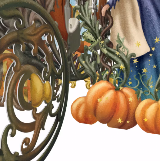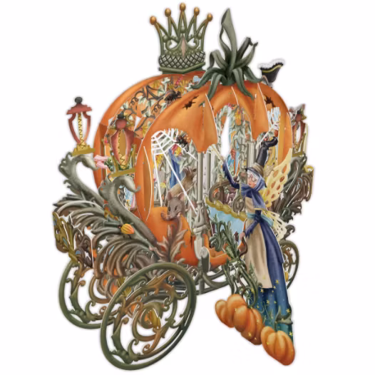 Här finns Askungens vagn som hon ska åka till balen med. Det som är särskilt underbart är att du kan se vagnen från två sidor. På ena sidan är det den vackra vagn som hon vill att prinsen och alla på slottet ska se. Från den andra sidan ser du hur vagnen såg ut innan den förvandlades från att vara en pumpa inklusive djuren som också förvandlats för att möjliggöra illusionen. Nu gäller det bara att Askungen kommer ihåg att lämna balen innan klockan slår 12...