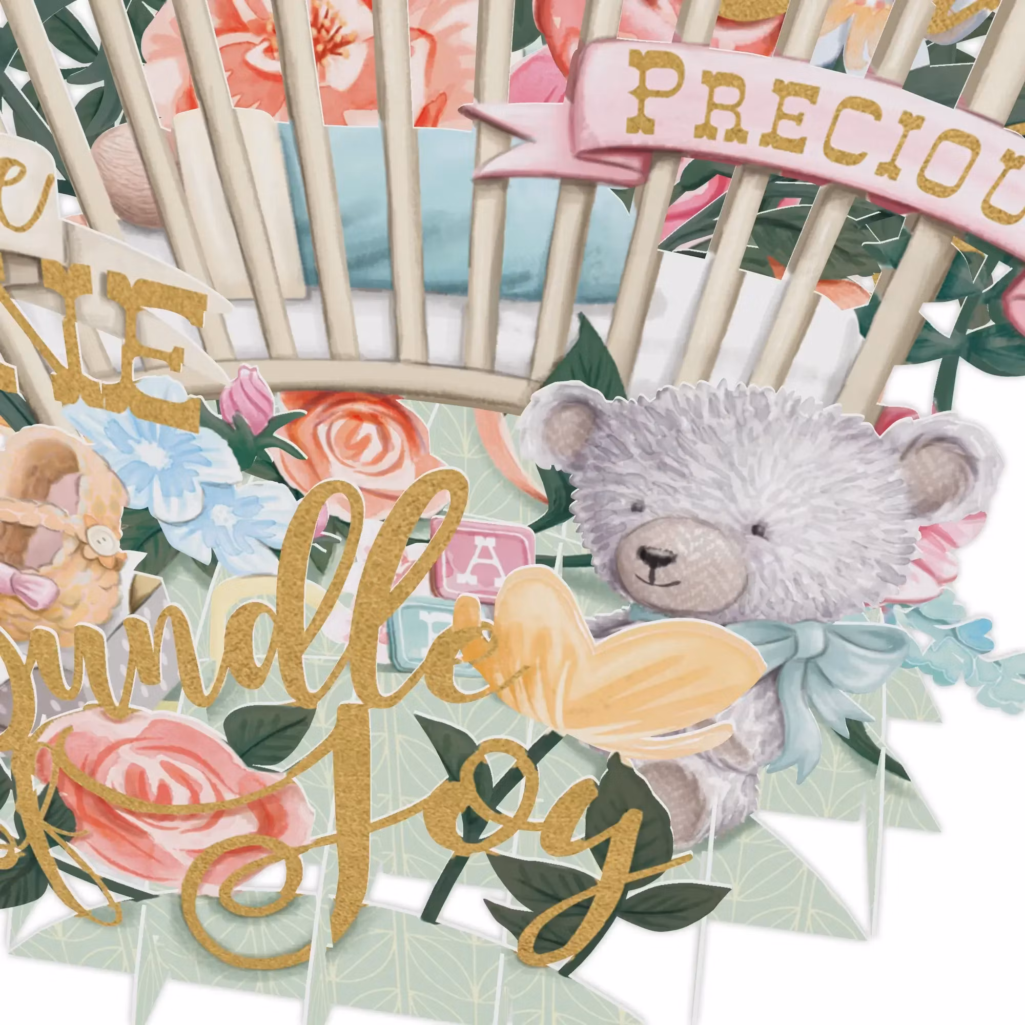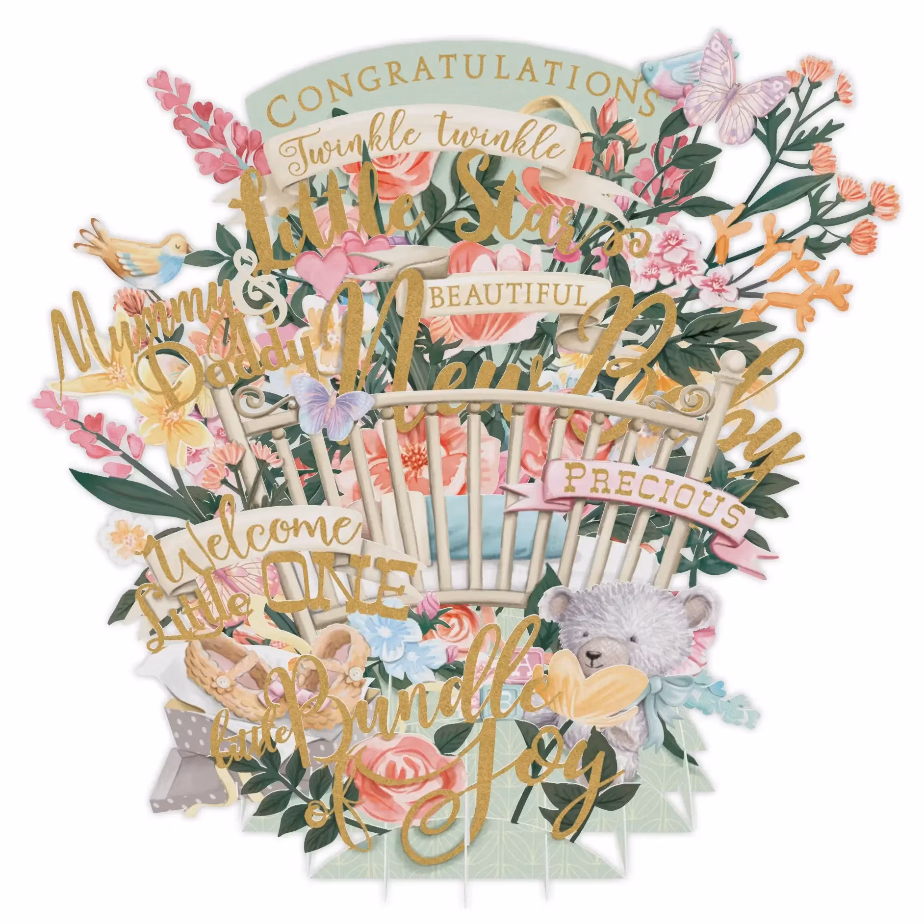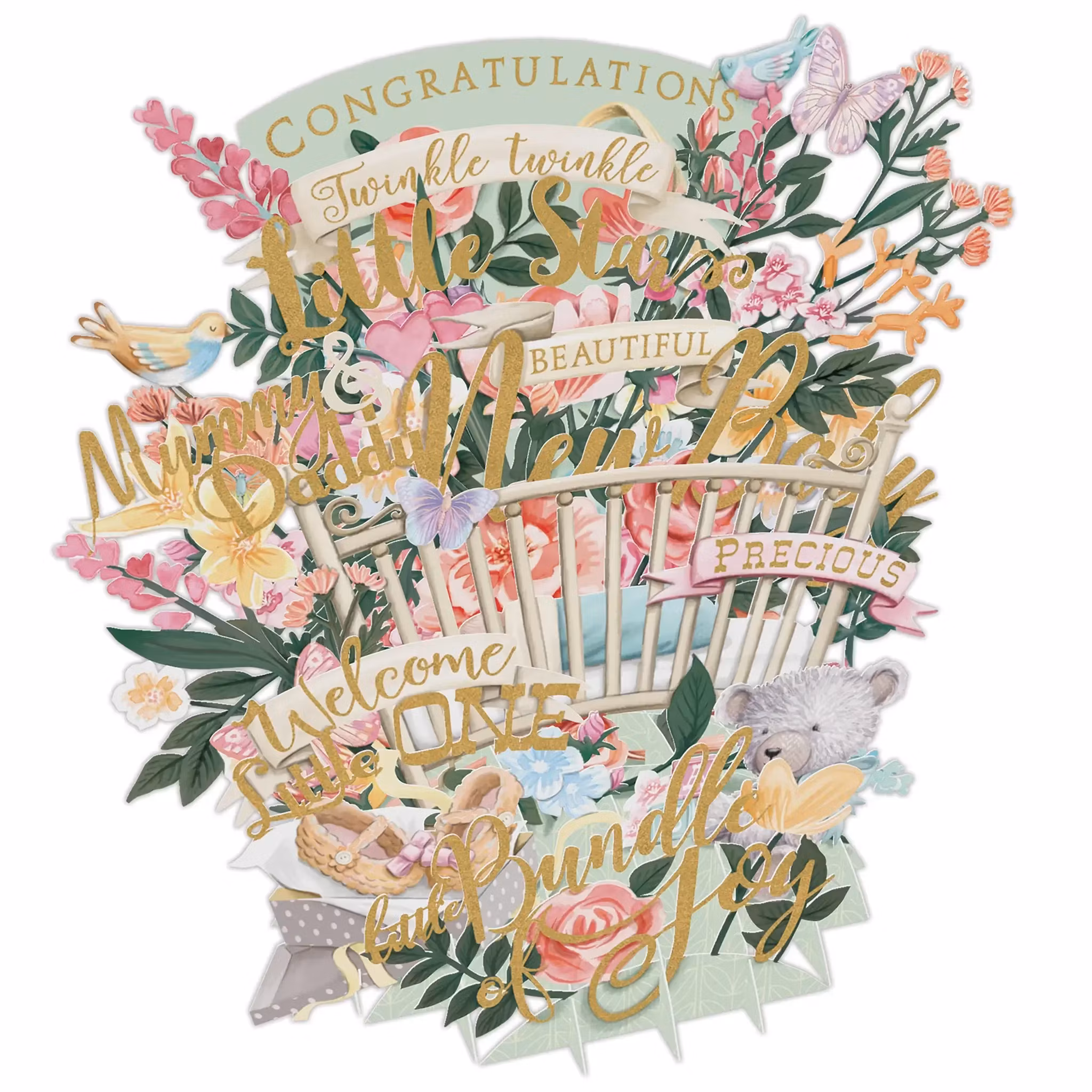 Magiskt, underbart kort som välkomnar någon ny liten till världen. Det här är ett fantastiskt fint kort som du viker ut och viker upp. Ingen montering behövs men det här kortet (eller prydnaden) kommer verkligen slå mottagaren med häpnad! Det är så fint att mottagaren kommer vilja ha det stående som dekoration på en byrå eller hylla och titta på det om och om igen!