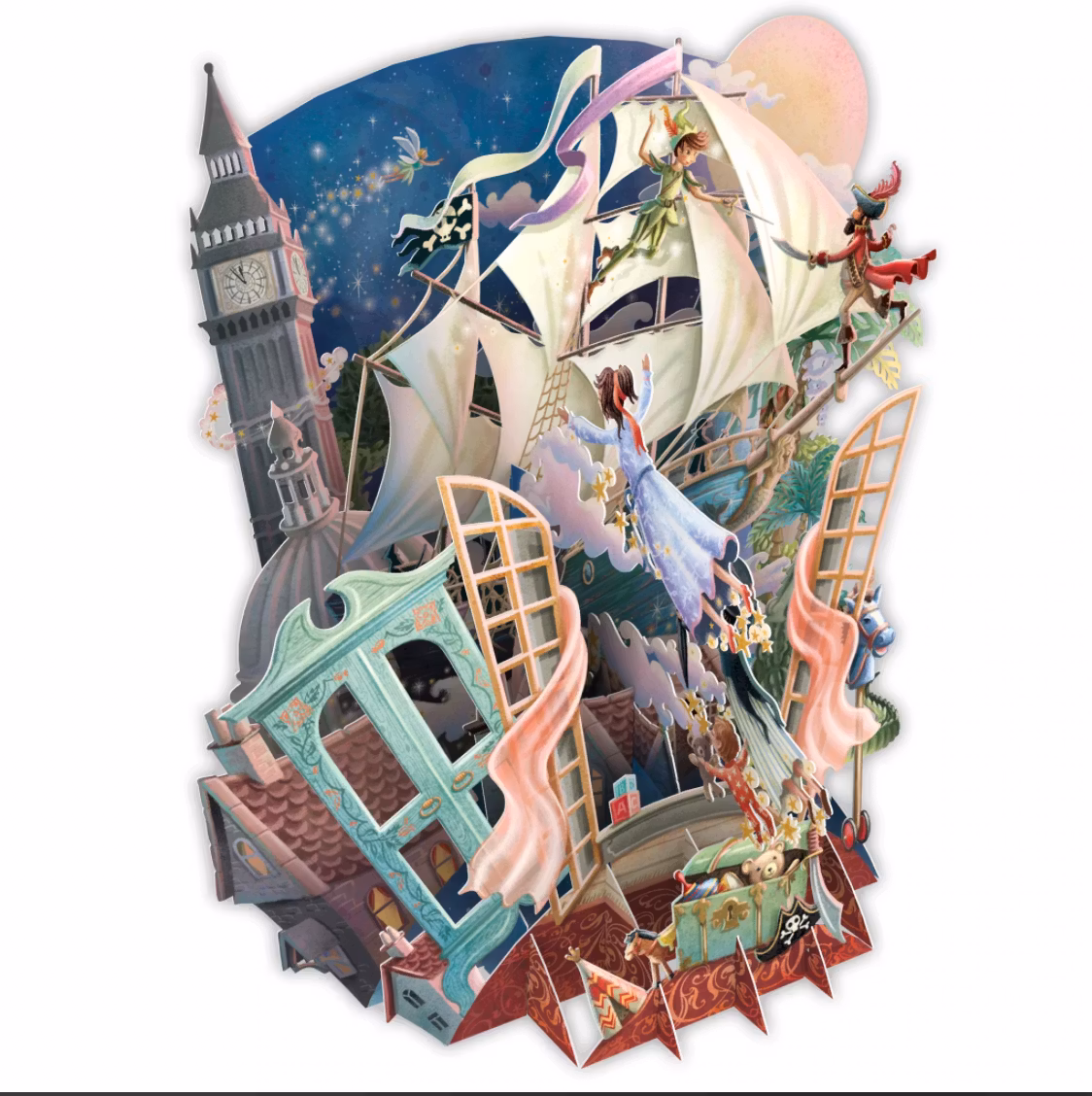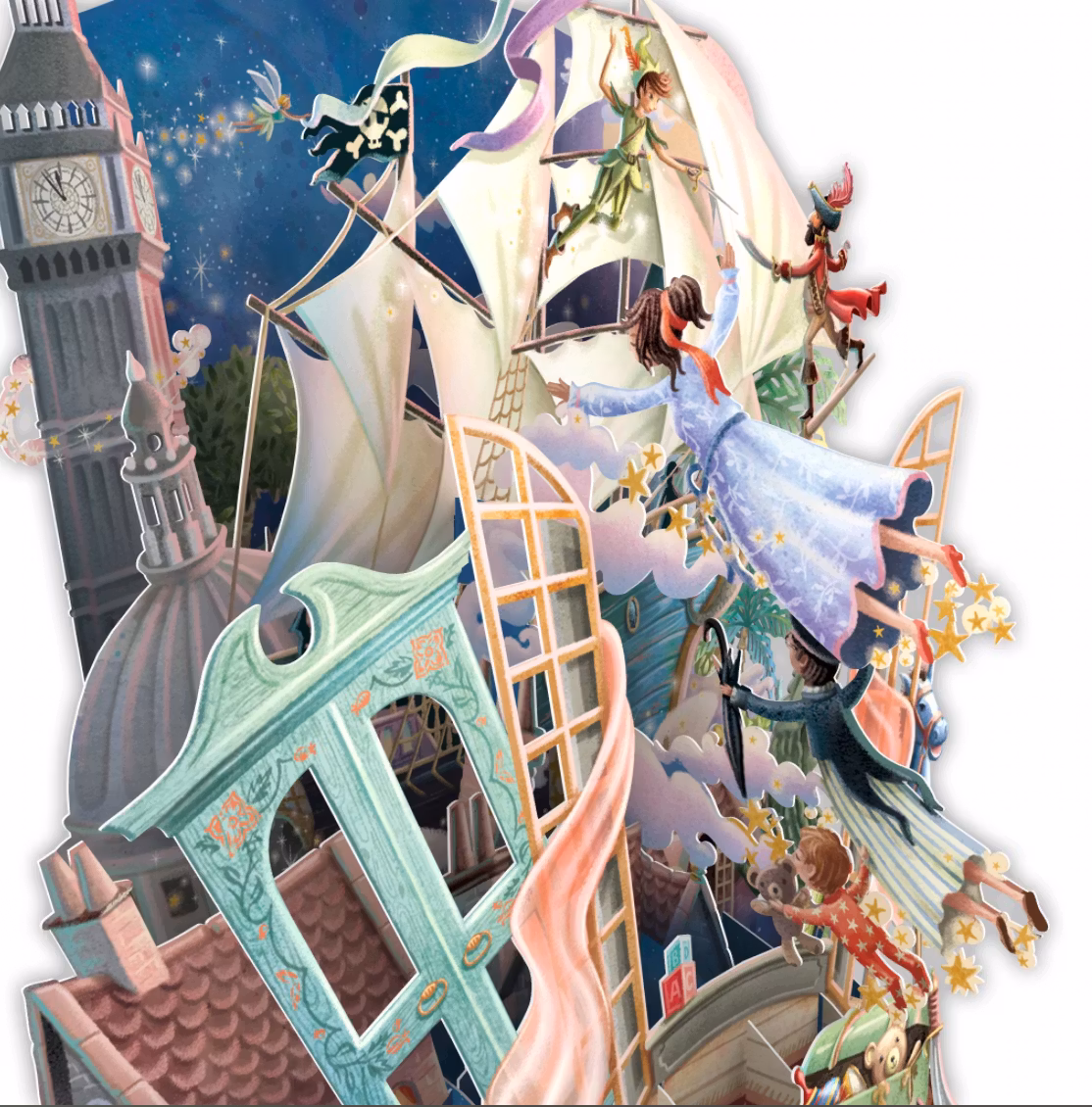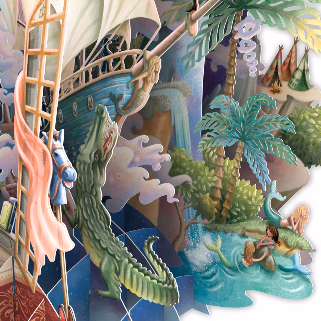 Här kommer Peter Pan och alla hans vänner. Är det kanske på väg till Landet Ingenstans? Här finns även Kapten Krook, Krokodilen Tick Tack och vackra sjöjungfrur. Underbart kort fullt av fantasi och vackra, magiska färger.