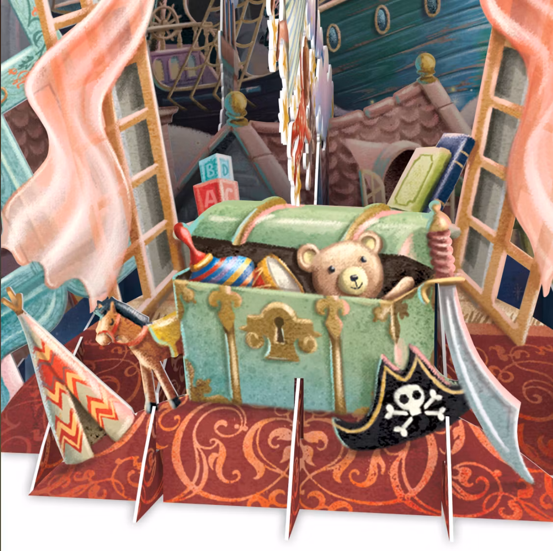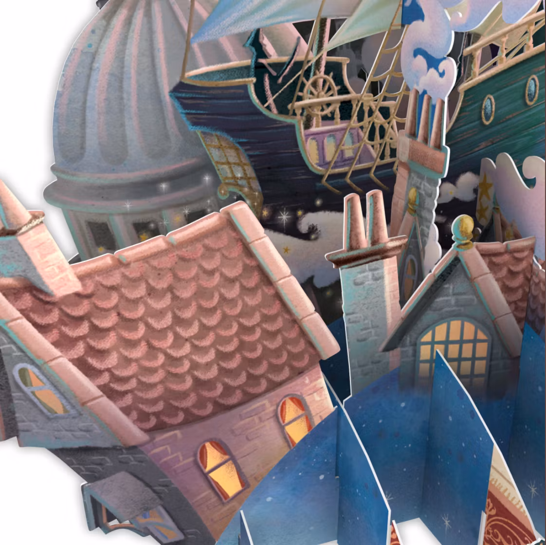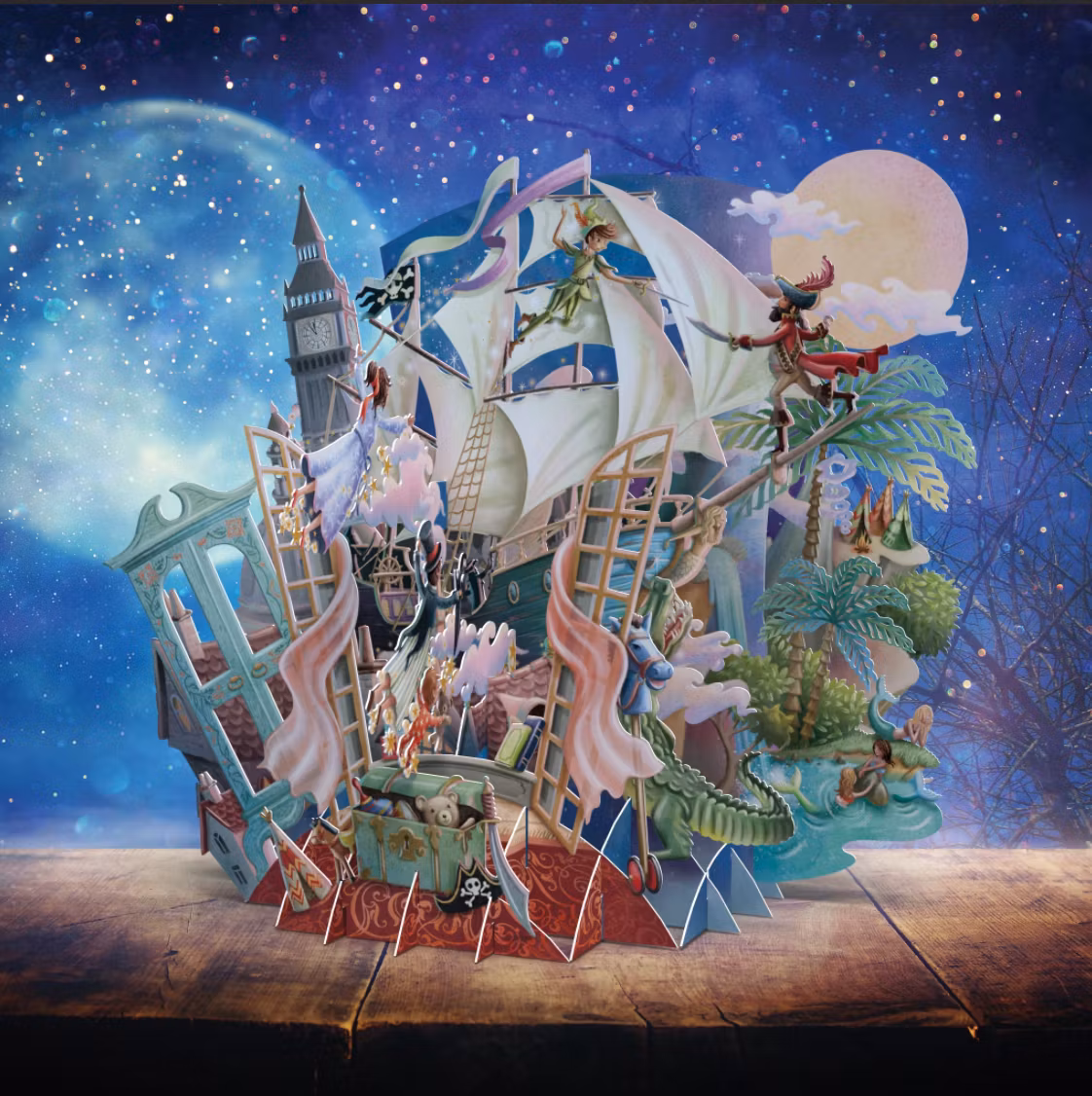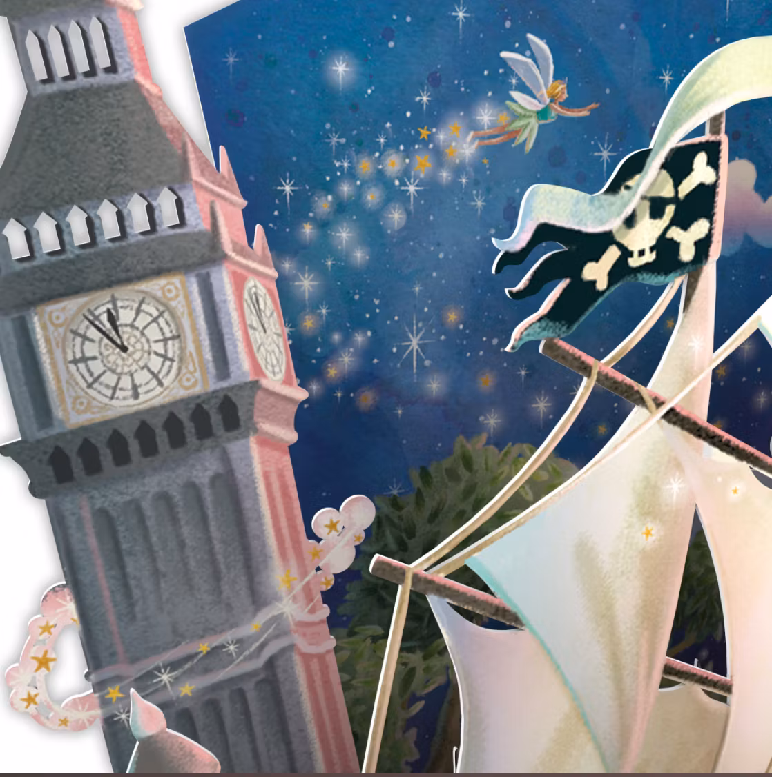 Här kommer Peter Pan och alla hans vänner. Är det kanske på väg till Landet Ingenstans? Här finns även Kapten Krook, Krokodilen Tick Tack och vackra sjöjungfrur. Underbart kort fullt av fantasi och vackra, magiska färger.