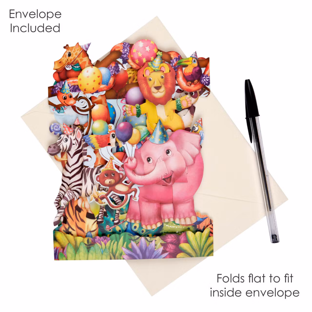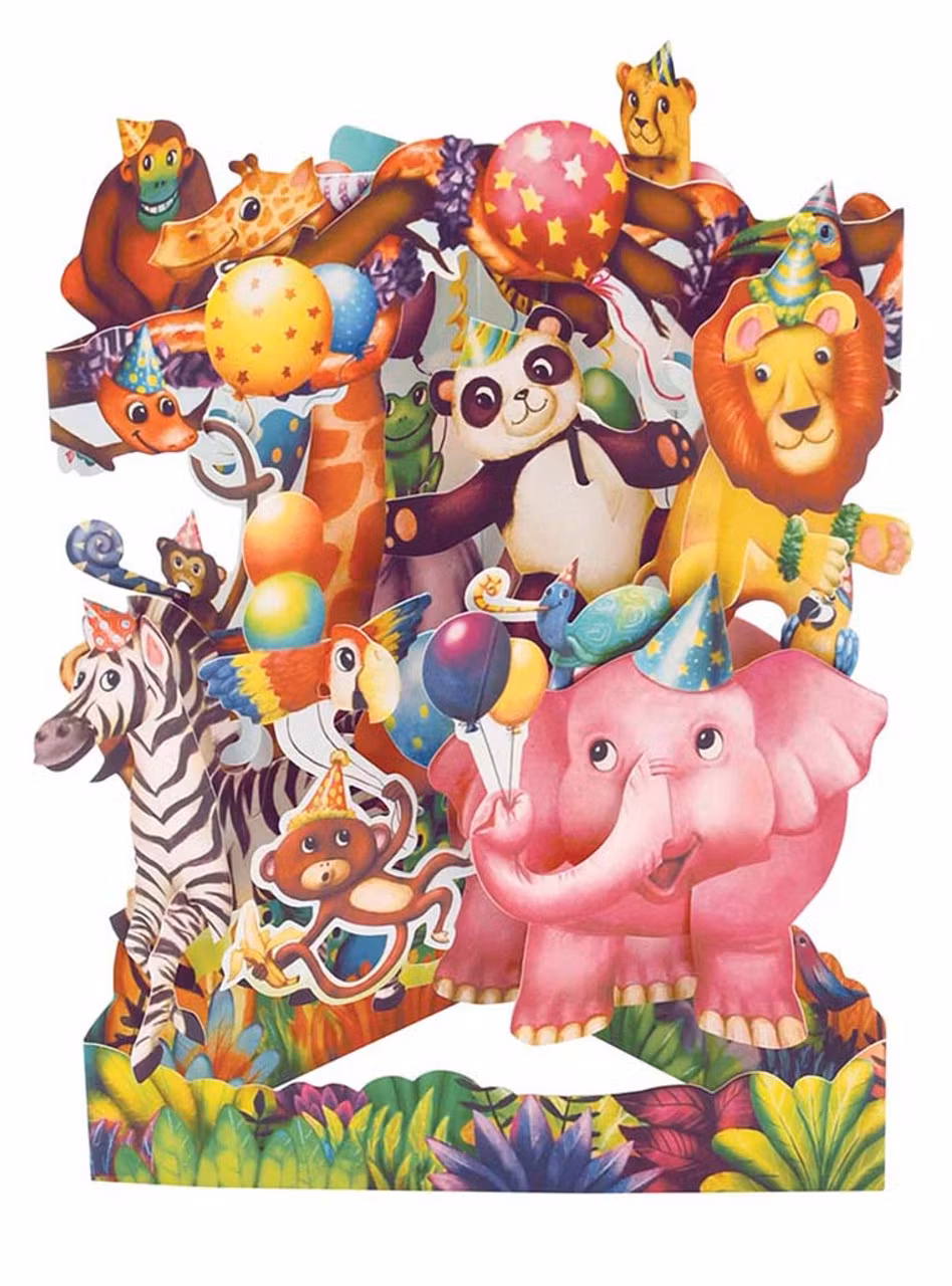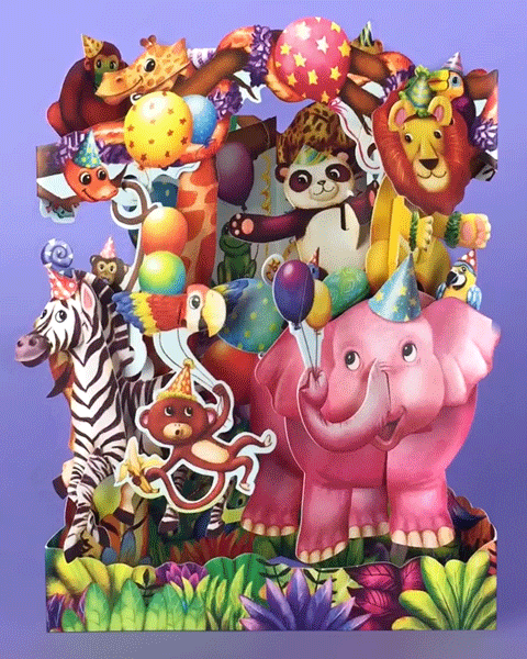 Ett riktigt fint, utvikbart kort med flera rörliga delar. Här gungar djuren fram och tillbaka medan de framför sina gratulationer. Kortet är målat vackra, klara färger som skapar en härlig känsla. Det här kortet levereras platt och mottagaren viker sedan lätt upp det. Du skriver din hälsning till mottagaren på baksidan av kortet. Det här är mer som en kombination av kort och present än enbart ett kort. Mottagaren kommer vilja ha kortet framme länge, länge för att hinna titta på det ordentligt.