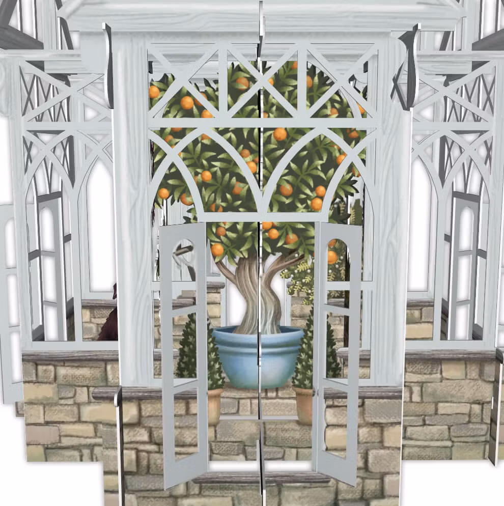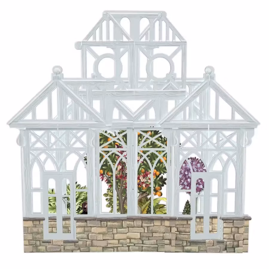 Underbart vackert glashus med ett apelsinträd i husets mitt. En liten hund sitter därinne och väntar på att du ska komma in.