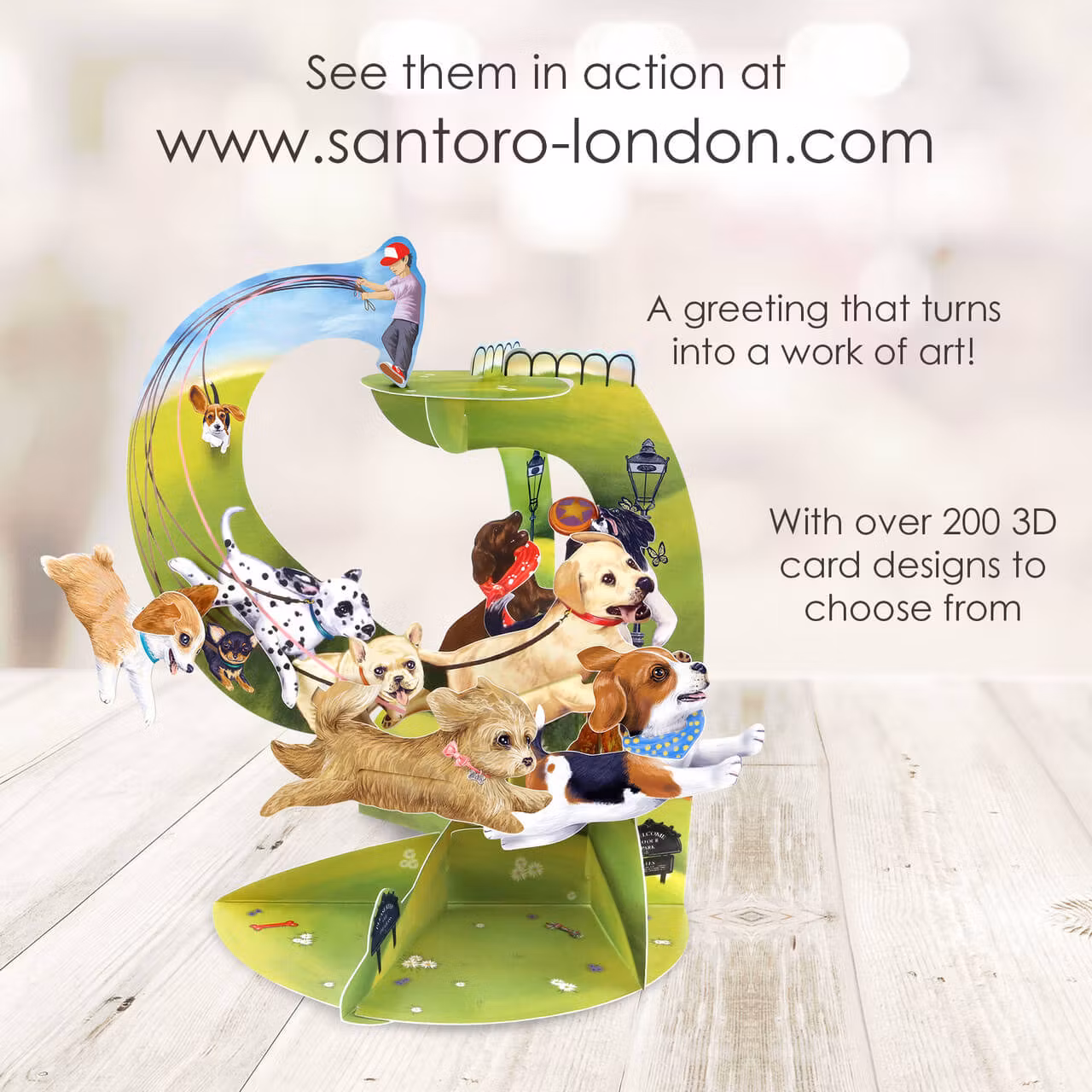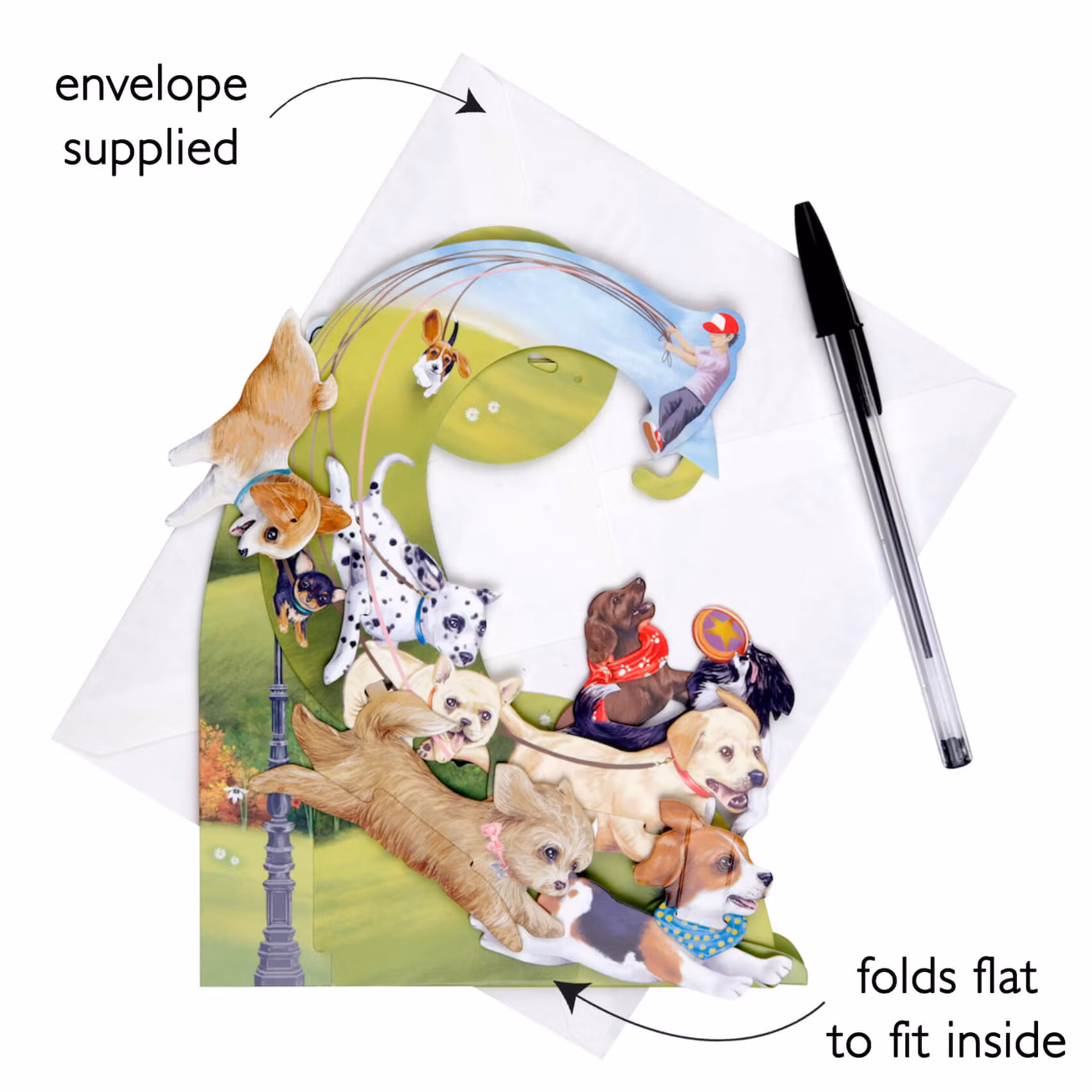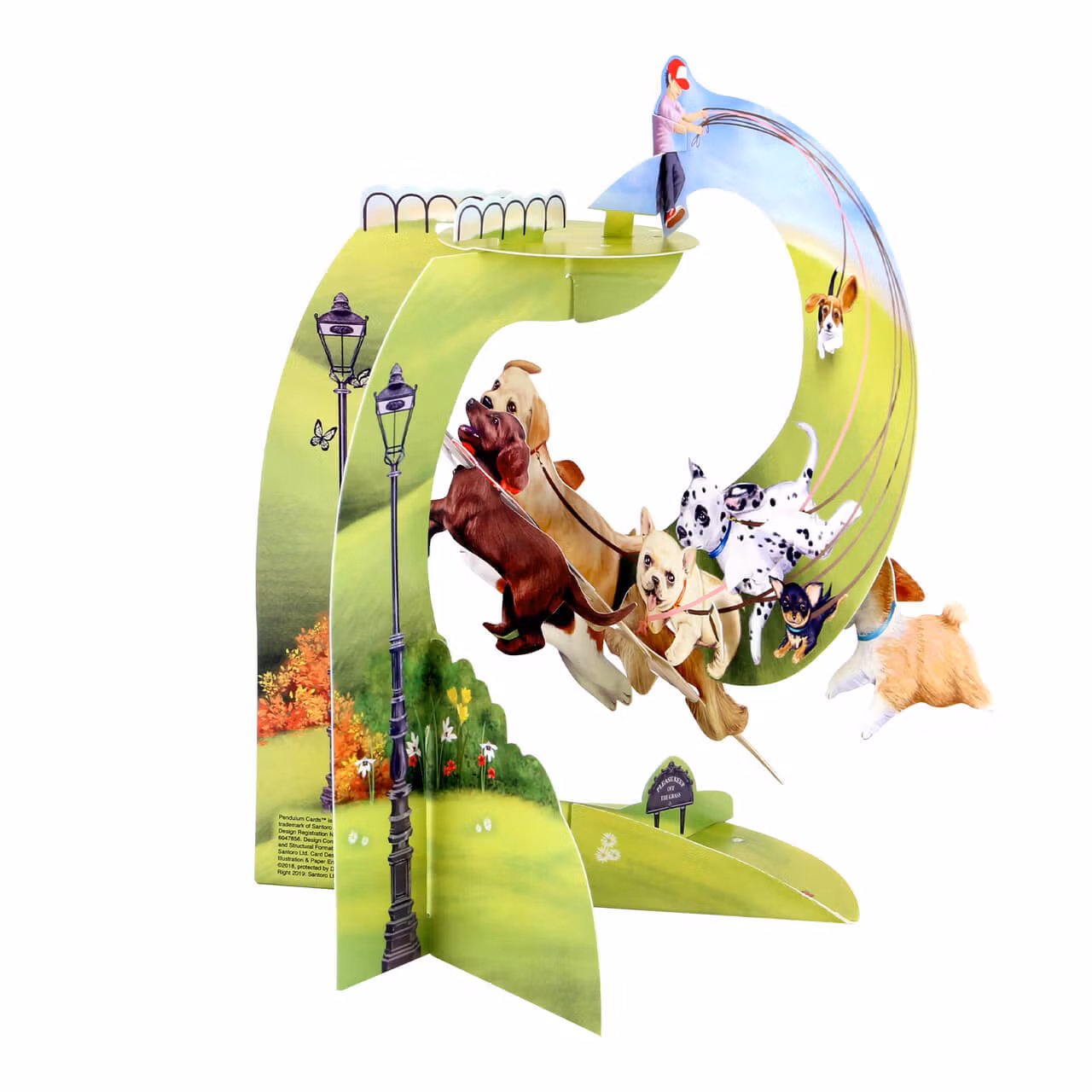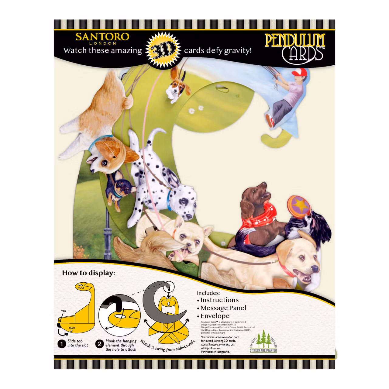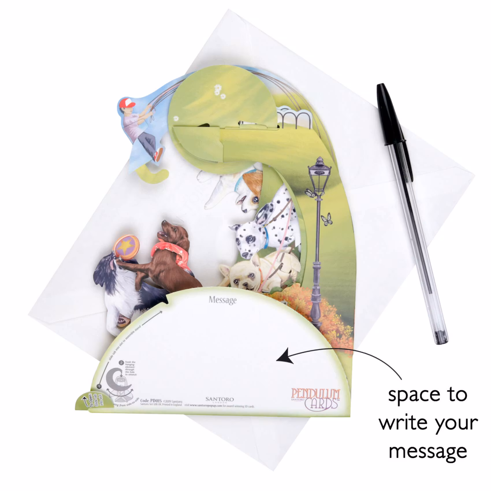 Ett riktigt fint, utvikbart kort med flera rörliga delar. Här gungar de springande hundarna fram. Det här kortet levereras platt och mottagaren viker sedan lätt upp det. Du skriver din hälsning till mottagaren på baksidan av kortet.