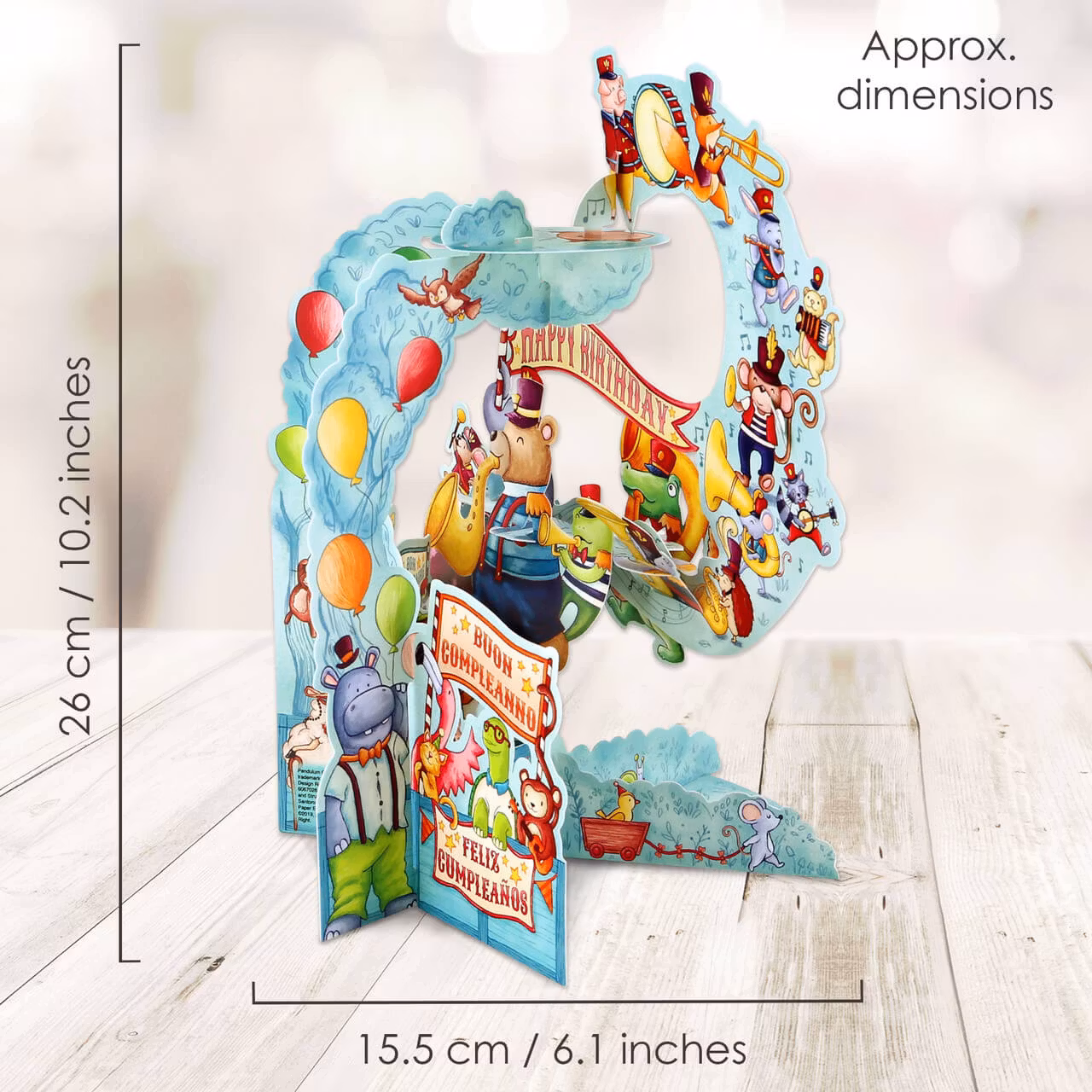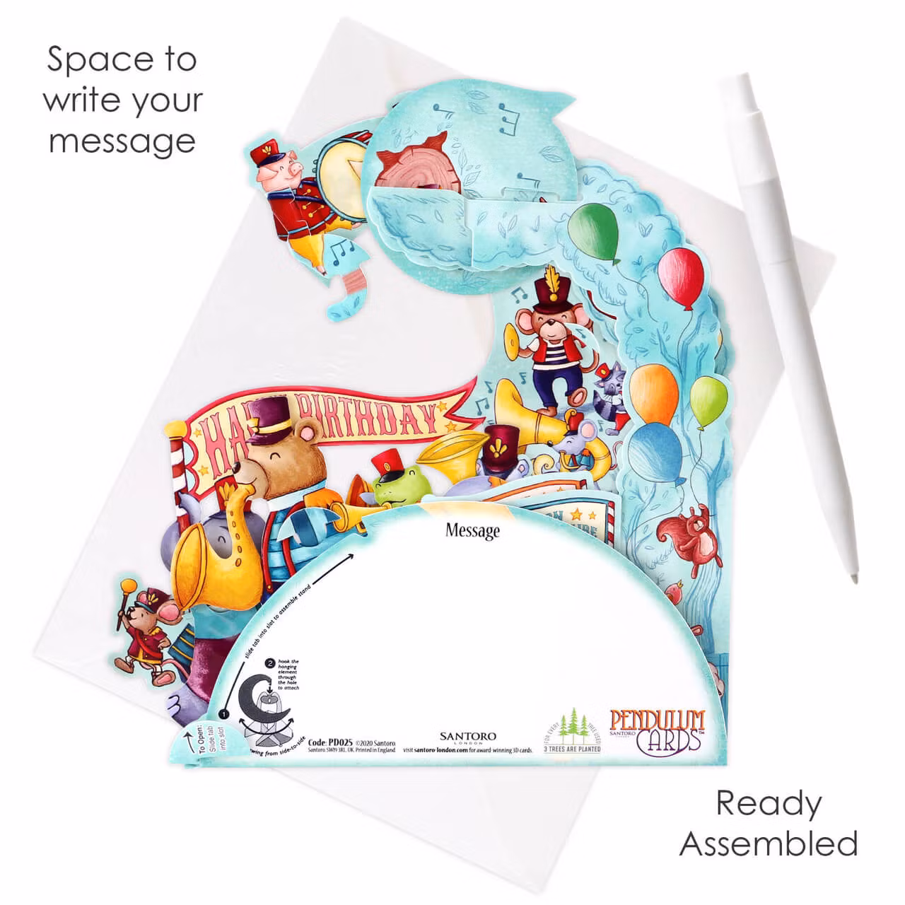 Ett riktigt fint, utvikbart kort med flera rörliga delar. Här kommer hela den fantastiska musikorkestern för att hylla mottagaren av detta kort. Det här kortet levereras platt och mottagaren viker sedan lätt upp det. Du skriver din hälsning till mottagaren på baksidan av kortet.