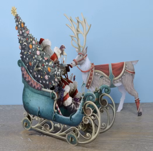 Här kommer tomten med släden dragen av din egen ren Underbart julkort som du viker ut och viker upp.