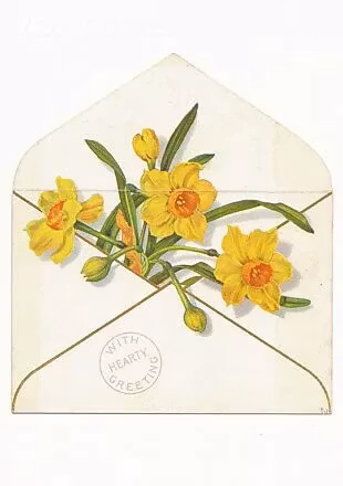 Underbart vackert enkelt kort med motiv av vackra påskliljor i ett kuvert.