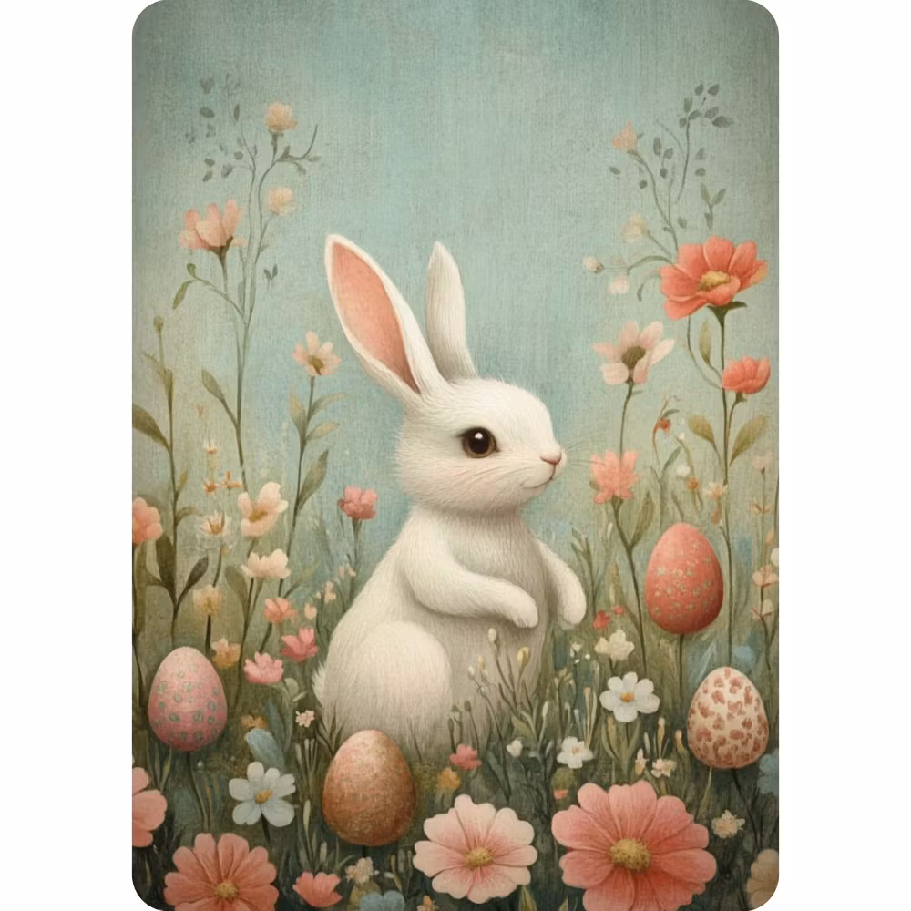 Vackert kort med haren som står omgiven av vackra ägg på den vackra ängen.