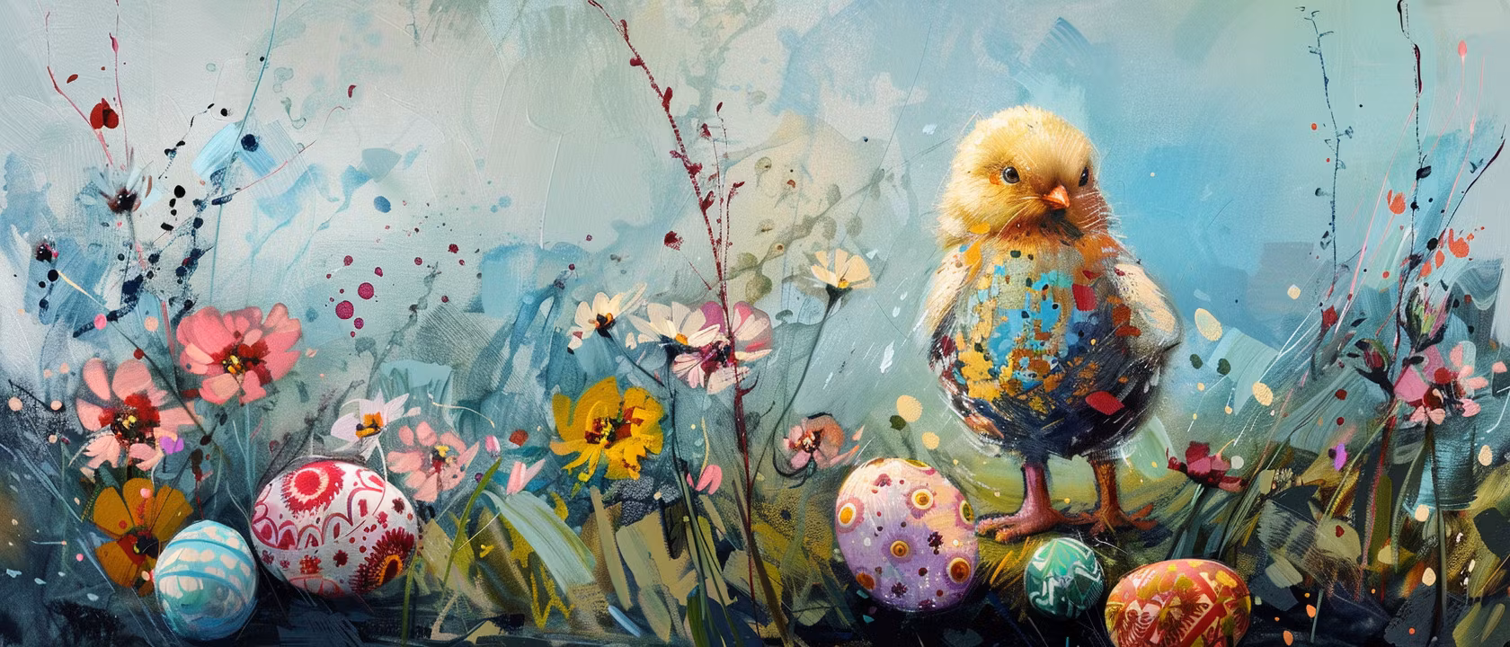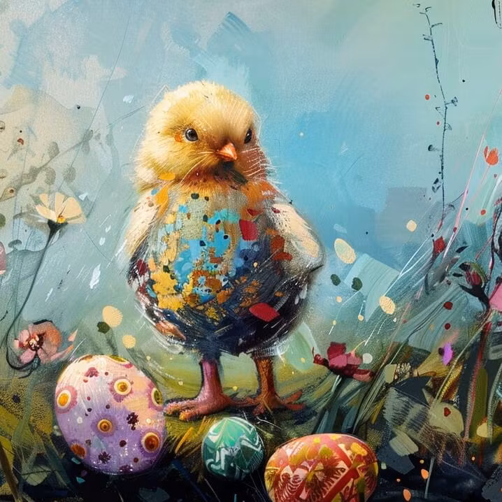 Underbart litet kort med kycklingen som har blivit kladdig av färg när han målat de fina äggen.