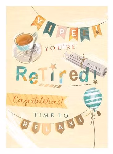 På kortet står det "Yipee! You´re retired! Congratulations! Time to relax!".