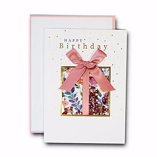 Ett mycket speciellt kort med en riktig rosett och paljetter i paketet under rosetten. På kortet står det "Happy Birthday". Det medföljer ett kuvert.