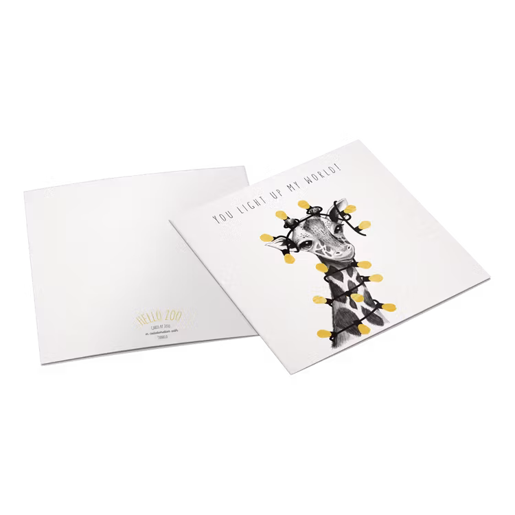 Kortet har en matt yta, giraffen är svart-vit och har en ljusslinga med glödlampor i guld. Kortet är vikt - och på insidan kan du skriva den hälsning som passar.