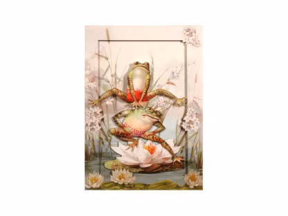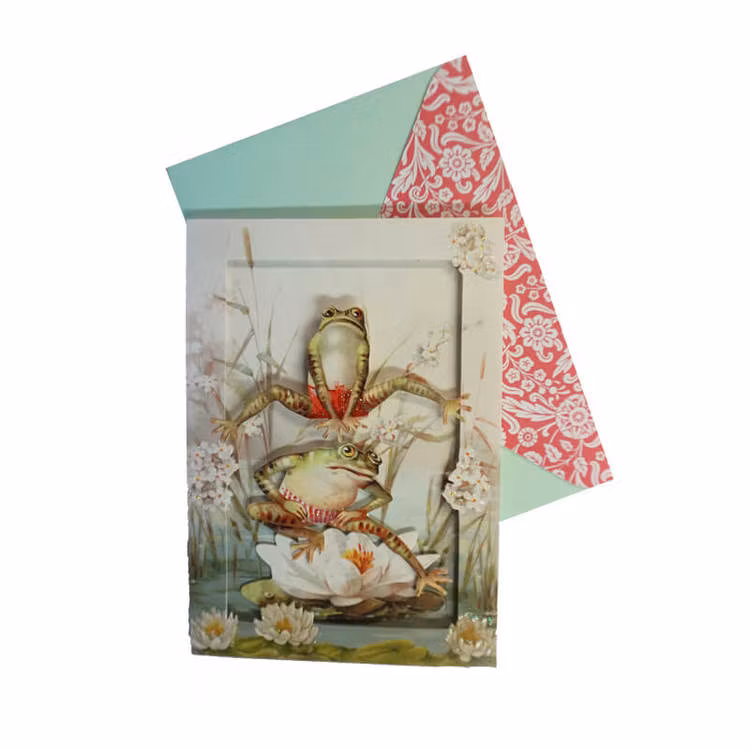 Helt fantastiskt gratulationskort med 3D motiv. Ett grodhopp har aldrig varit tjusigare! De här förtjusande grodorna övar parakrobatik i dammen. Det finns också näckrosblad att landa på.