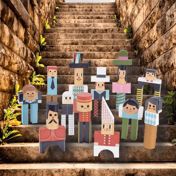 Snygga klossar i trä att bygga roligt folk med. Med 50 st klossar: huvud-klossar, överkropp-klossar och ben-klossar är kombinationerna oändliga. Målade i härliga retro-färger och snygga mönster. Roligt för stora också...
