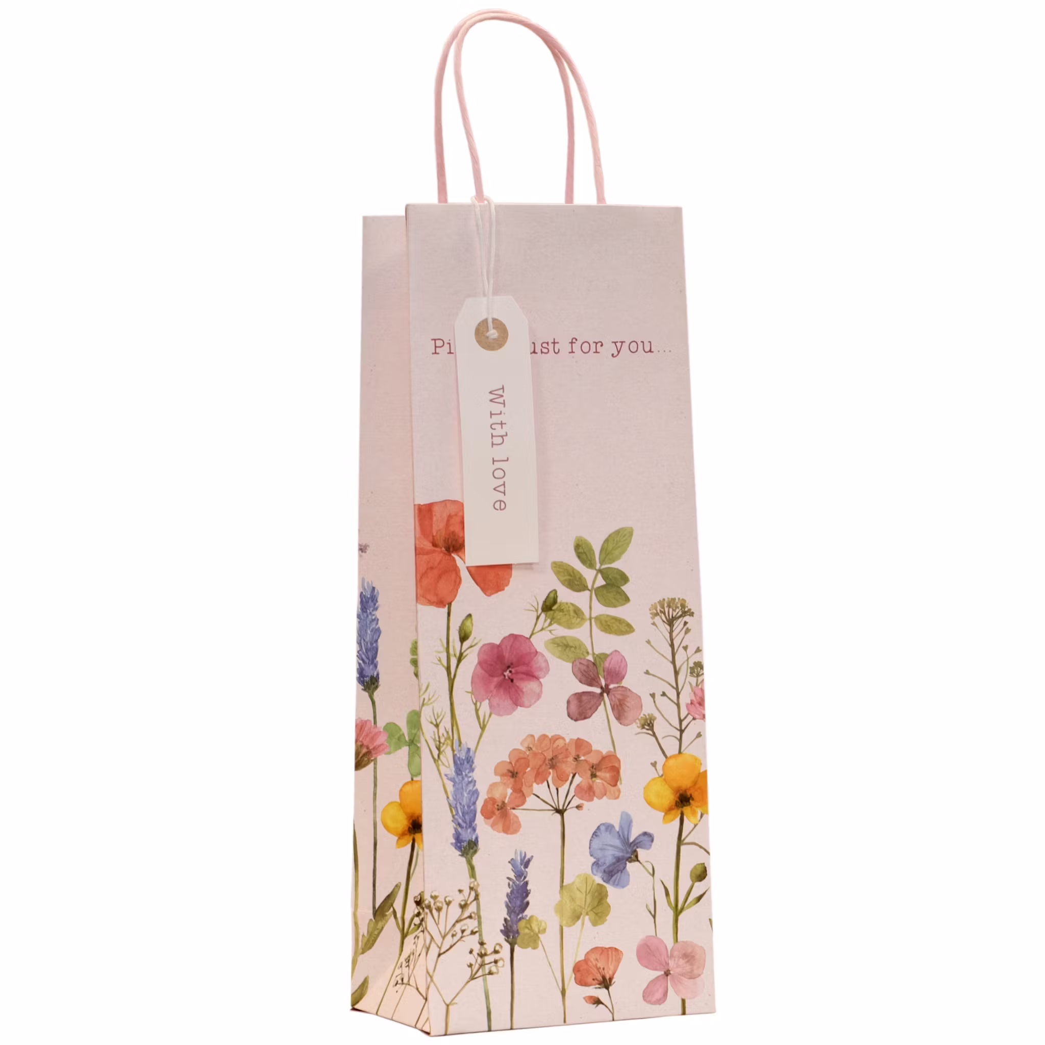 En fin påse med motiv från en sommaräng. Påsen är hög och smal och avsedd för en flaska.