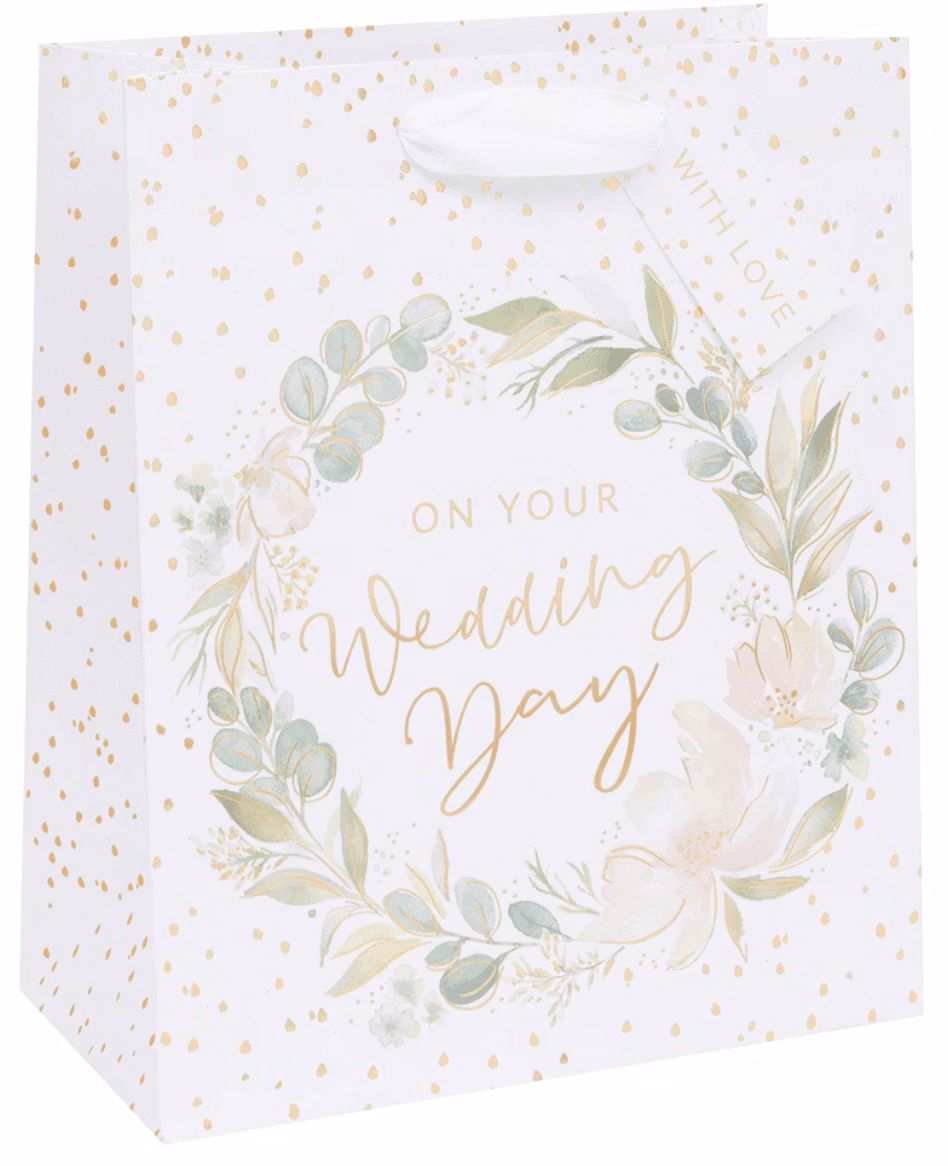 Vacker påse med texten "On your wedding day". På framsidan av påsen är många detaljer i guld.