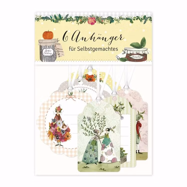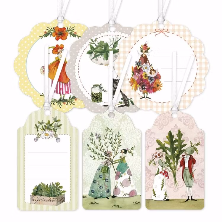 Det följer med tre runda och tre avlånga etiketter i förpackningen och det sitter ett vitt satinband i varje hängsmycke.