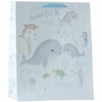 Det sitter fast ett litet kort på påsen i form av en val med texten: "Baby boy". På baksidan av det kan du skriva din hälsning till mottagaren.