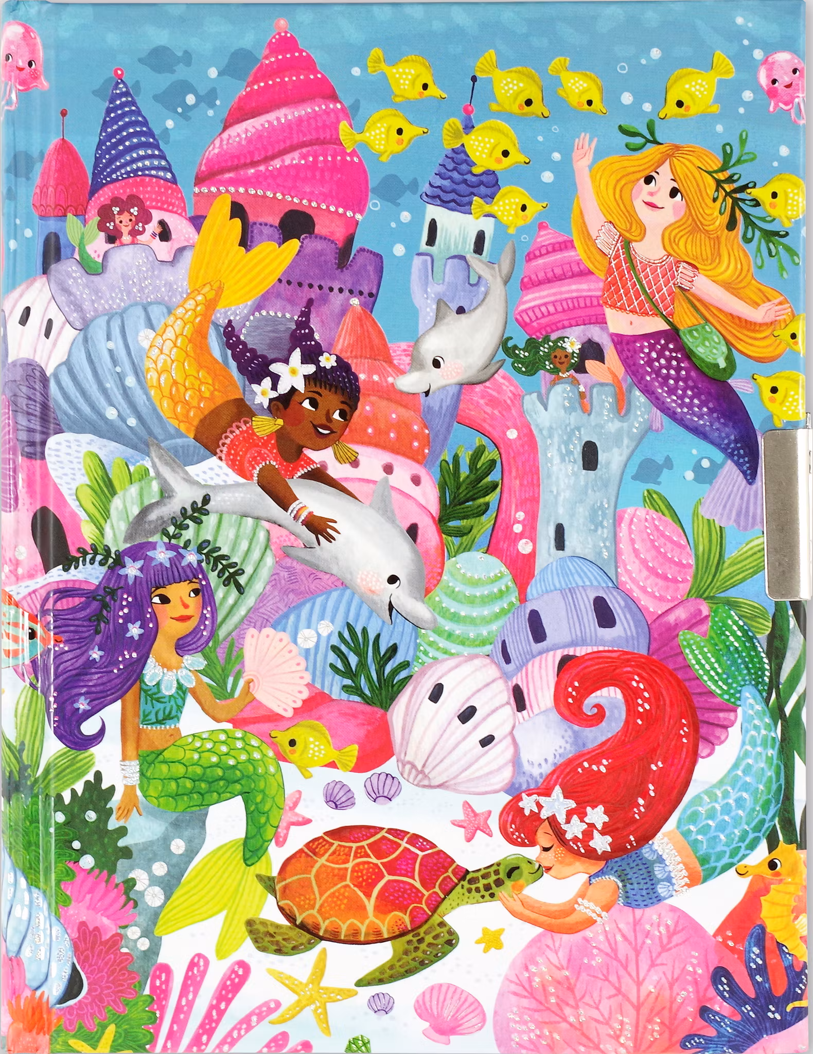 Härlig dagbok med sjöjungfrur i klara, vackra färger. Vissa delar av motivet är i silver för en extra lyxig känsla.